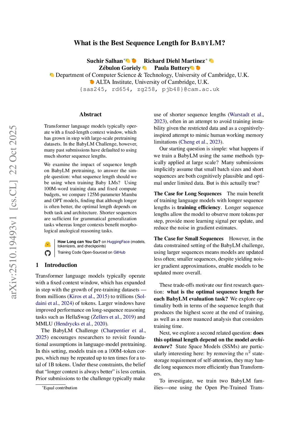 Transformer language models typically operate with a fixed-length context window, which has grown in step with large-scale pretraining datasets. In the BabyLM Challenge, however, many past submissions have defaulted to using much shorter sequence lengths. We examine the impact of sequence length on BabyLM pretraining, to answer the simple question: what sequence length should we be using when training Baby LMs? Using 100M-word training data and fixed compute budgets, we compare 125M-parameter Mamba and OPT models, finding that although longer is often better, the optimal length depends on both task and architecture. Shorter sequences are sufficient for grammatical generalization tasks whereas longer contexts benefit morphological analogical reasoning tasks.