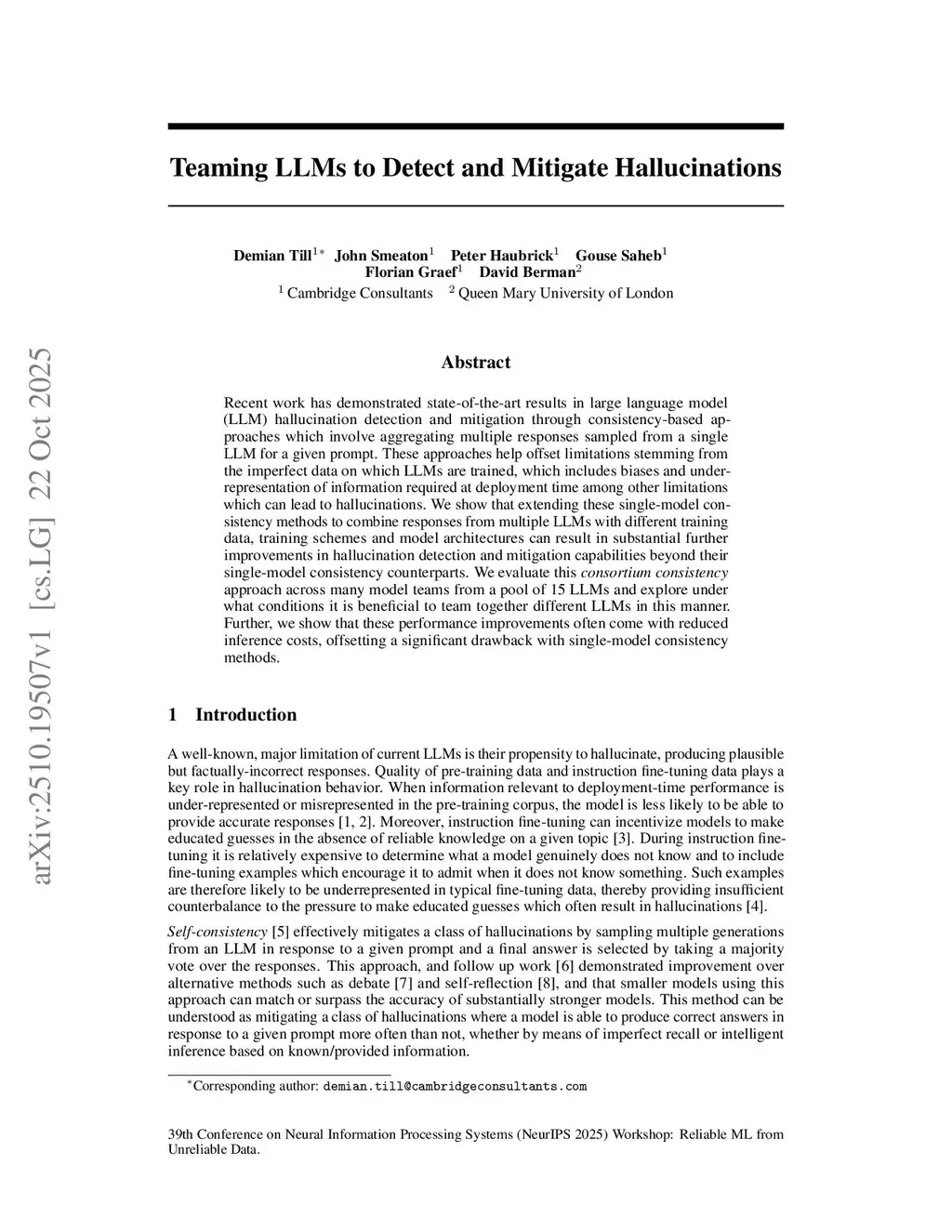 Recent work has demonstrated state-of-the-art results in large language model (LLM) hallucination detection and mitigation through consistency-based approaches which involve aggregating multiple responses sampled from a single LLM for a given prompt. These approaches help offset limitations stemming from the imperfect data on which LLMs are trained, which includes biases and under-representation of information required at deployment time among other limitations which can lead to hallucinations. We show that extending these single-model consistency methods to combine responses from multiple LLMs with different training data, training schemes and model architectures can result in substantial further improvements in hallucination detection and mitigation capabilities beyond their single-model consistency counterparts. We evaluate this "consortium consistency" approach across many model teams from a pool of 15 LLMs and explore under what conditions it is beneficial to team together different LLMs in this manner. Further, we show that these performance improvements often come with reduced inference costs, offsetting a significant drawback with single-model consistency methods.