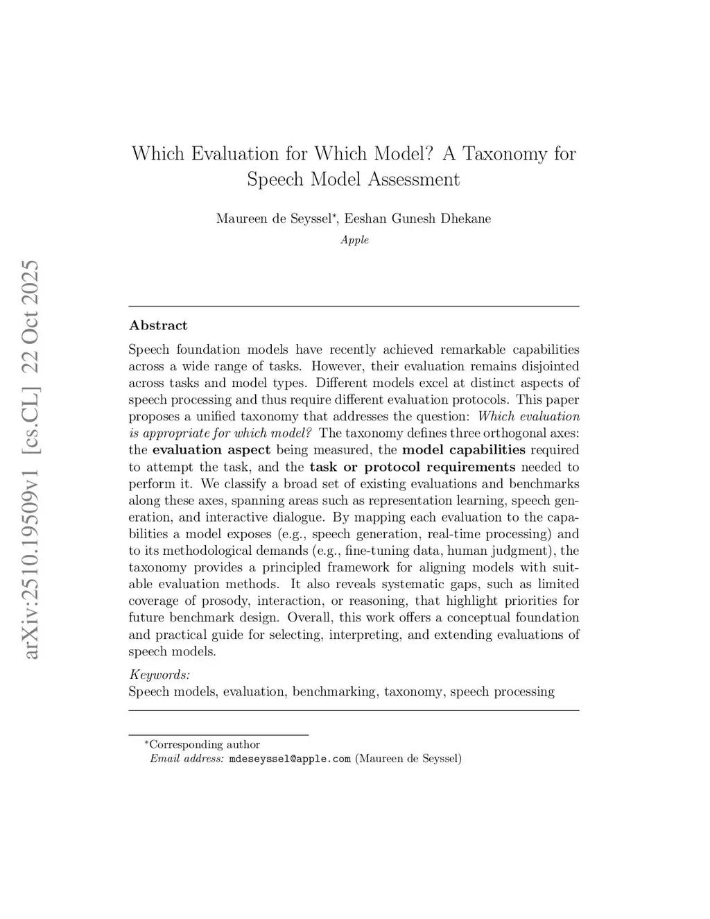 Which Evaluation for Which Model? A Taxonomy for Speech Model Assessment