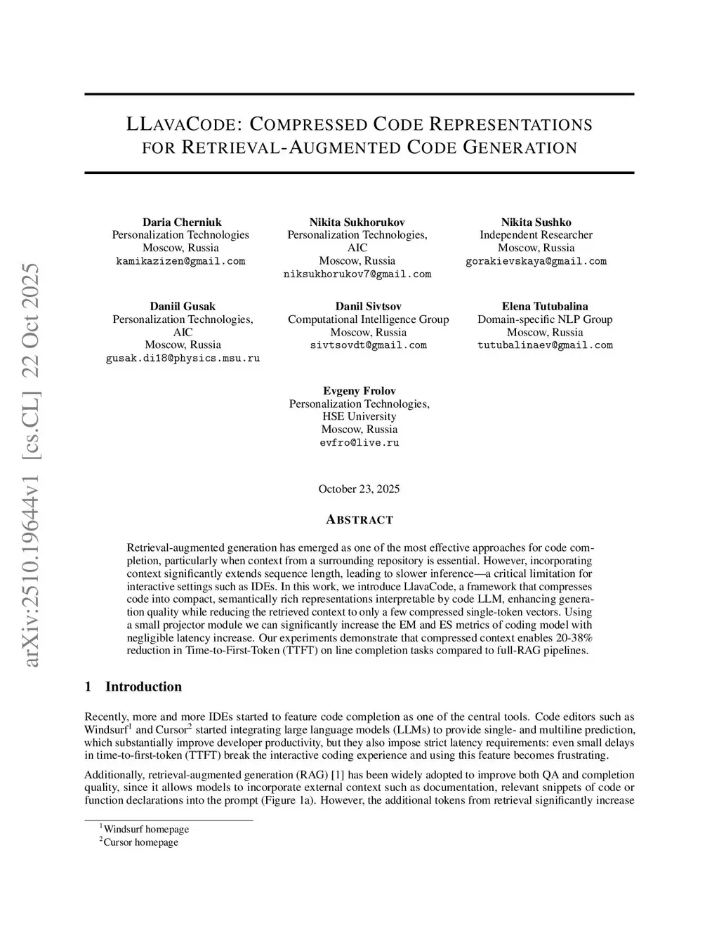 Retrieval-augmented generation has emerged as one of the most effective approaches for code completion, particularly when context from a surrounding repository is essential. However, incorporating context significantly extends sequence length, leading to slower inference - a critical limitation for interactive settings such as IDEs. In this work, we introduce LlavaCode, a framework that compresses code into compact, semantically rich representations interpretable by code LLM, enhancing generation quality while reducing the retrieved context to only a few compressed single-token vectors. Using a small projector module we can significantly increase the EM and ES metrics of coding model with negligible latency increase. Our experiments demonstrate that compressed context enables 20-38% reduction in Time-to-First-Token (TTFT) on line completion tasks compared to full-RAG pipelines.