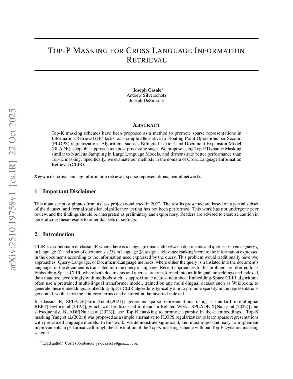 Top-P Masking for Cross Language Information Retrieval