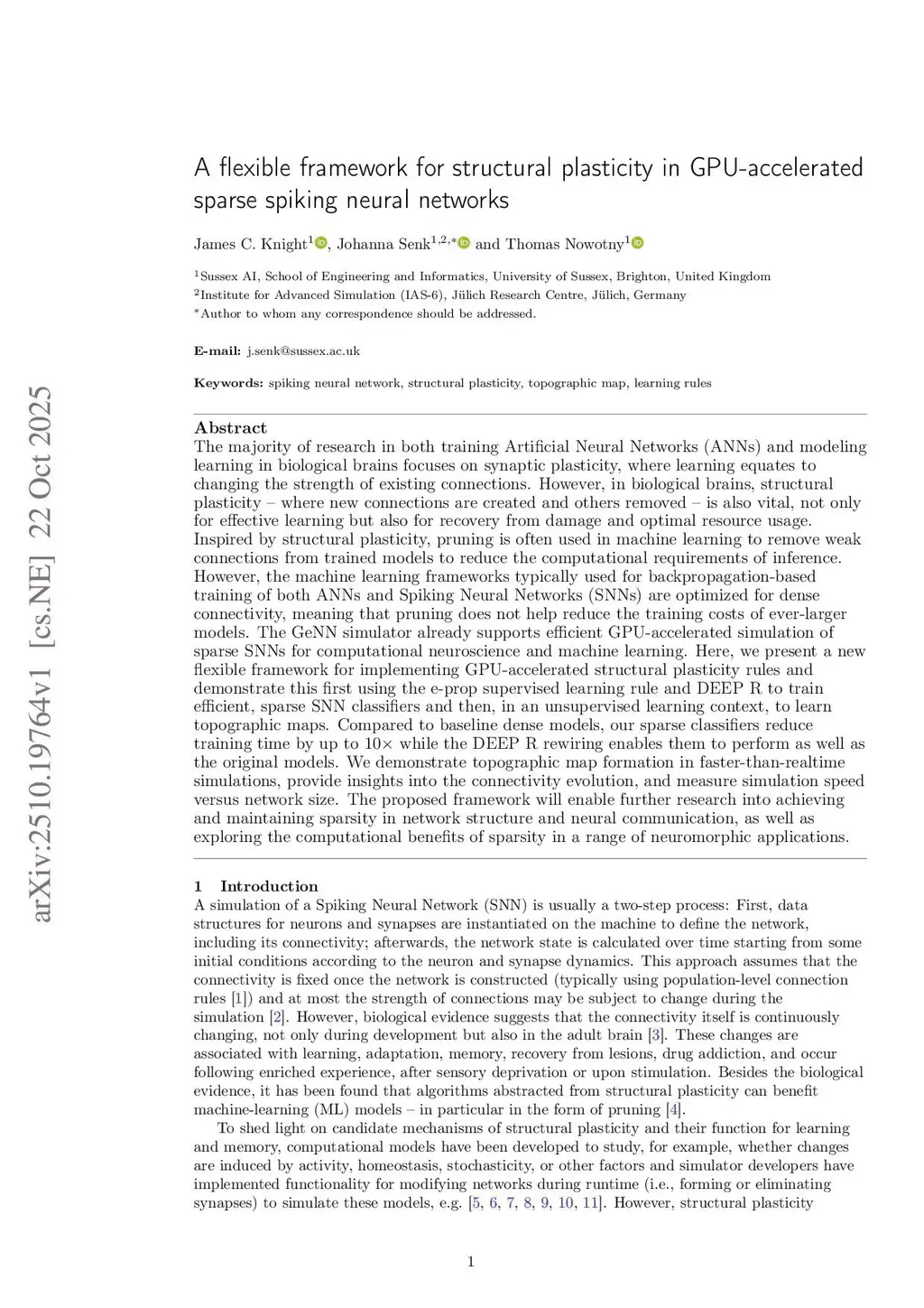 The majority of research in both training Artificial Neural Networks (ANNs) and modeling learning in biological brains focuses on synaptic plasticity, where learning equates to changing the strength of existing connections. However, in biological brains, structural plasticity - where new connections are created and others removed - is also vital, not only for effective learning but also for recovery from damage and optimal resource usage. Inspired by structural plasticity, pruning is often used in machine learning to remove weak connections from trained models to reduce the computational requirements of inference. However, the machine learning frameworks typically used for backpropagation-based training of both ANNs and Spiking Neural Networks (SNNs) are optimized for dense connectivity, meaning that pruning does not help reduce the training costs of ever-larger models. The GeNN simulator already supports efficient GPU-accelerated simulation of sparse SNNs for computational neuroscience and machine learning. Here, we present a new flexible framework for implementing GPU-accelerated structural plasticity rules and demonstrate this first using the e-prop supervised learning rule and DEEP R to train efficient, sparse SNN classifiers and then, in an unsupervised learning context, to learn topographic maps. Compared to baseline dense models, our sparse classifiers reduce training time by up to 10x while the DEEP R rewiring enables them to perform as well as the original models. We demonstrate topographic map formation in faster-than-realtime simulations, provide insights into the connectivity evolution, and measure simulation speed versus network size. The proposed framework will enable further research into achieving and maintaining sparsity in network structure and neural communication, as well as exploring the computational benefits of sparsity in a range of neuromorphic applications.