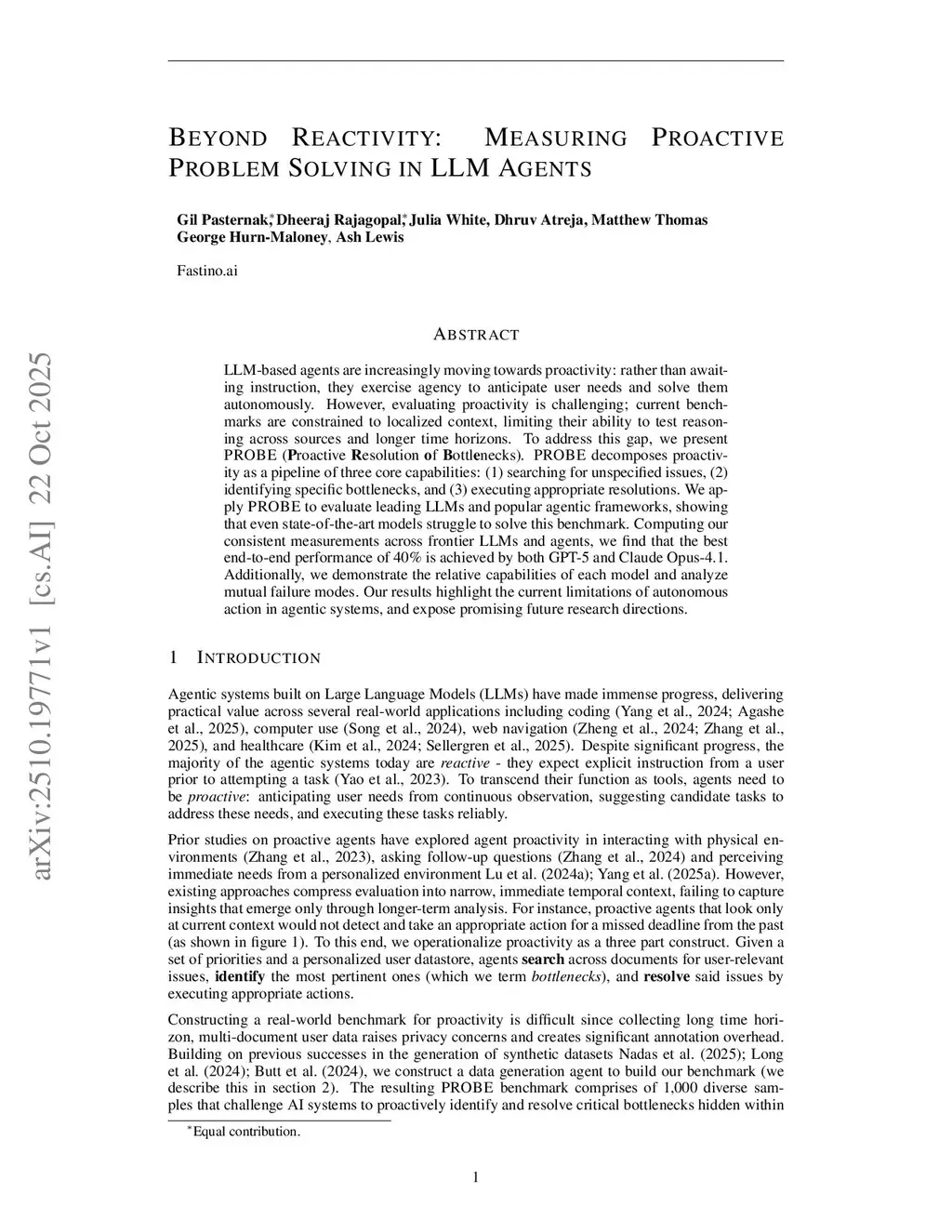 LLM-based agents are increasingly moving towards proactivity: rather than awaiting instruction, they exercise agency to anticipate user needs and solve them autonomously. However, evaluating proactivity is challenging; current benchmarks are constrained to localized context, limiting their ability to test reasoning across sources and longer time horizons. To address this gap, we present PROBE (Proactive Resolution Of BottlEnecks). PROBE decomposes proactivity as a pipeline of three core capabilities: (1) searching for unspecified issues, (2) identifying specific bottlenecks, and (3) executing appropriate resolutions. We apply PROBE to evaluate leading LLMs and popular agentic frameworks, showing that even state-of-the-art models struggle to solve this benchmark. Computing our consistent measurements across frontier LLMs and agents, we find that the best end-to-end performance of 40% is achieved by both GPT-5 and Claude Opus-4.1. Additionally, we demonstrate the relative capabilities of each model and analyze mutual failure modes. Our results highlight the current limitations of autonomous action in agentic systems, and expose promising future research directions.