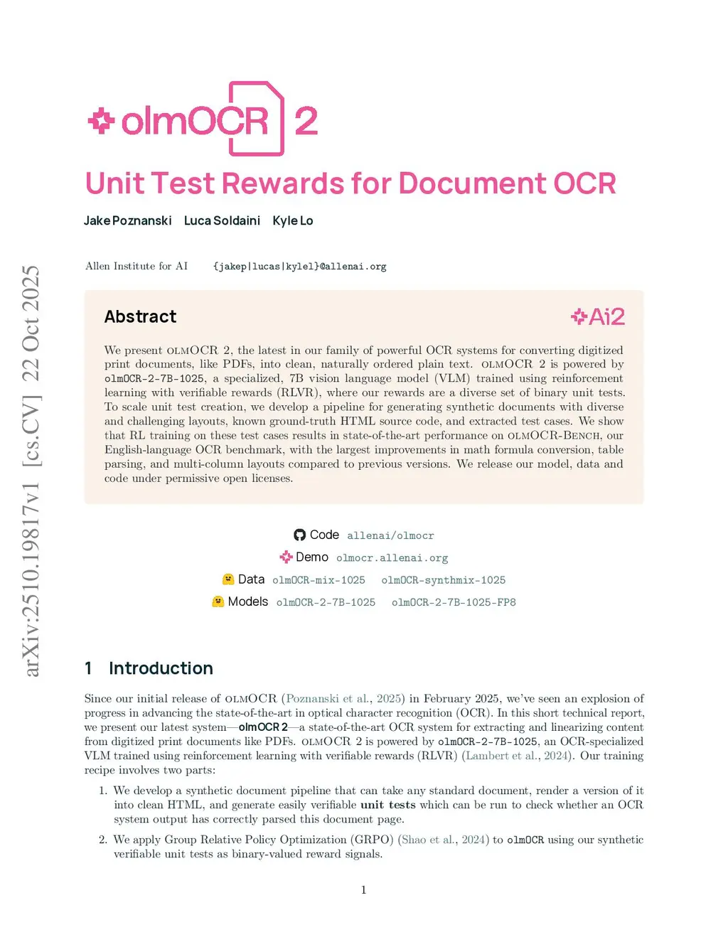 We present olmOCR 2, the latest in our family of powerful OCR systems for converting digitized print documents, like PDFs, into clean, naturally ordered plain text. olmOCR 2 is powered by olmOCR-2-7B-1025, a specialized, 7B vision language model (VLM) trained using reinforcement learning with verifiable rewards (RLVR), where our rewards are a diverse set of binary unit tests. To scale unit test creation, we develop a pipeline for generating synthetic documents with diverse and challenging layouts, known ground-truth HTML source code, and extracted test cases. We show that RL training on these test cases results in state-of-the-art performance on olmOCR-Bench, our English-language OCR benchmark, with the largest improvements in math formula conversion, table parsing, and multi-column layouts compared to previous versions. We release our model, data and code under permissive open licenses.