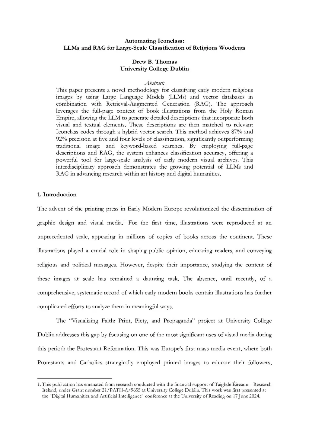 This paper presents a novel methodology for classifying early modern religious images by using Large Language Models (LLMs) and vector databases in combination with Retrieval-Augmented Generation (RAG). The approach leverages the full-page context of book illustrations from the Holy Roman Empire, allowing the LLM to generate detailed descriptions that incorporate both visual and textual elements. These descriptions are then matched to relevant Iconclass codes through a hybrid vector search. This method achieves 87% and 92% precision at five and four levels of classification, significantly outperforming traditional image and keyword-based searches. By employing full-page descriptions and RAG, the system enhances classification accuracy, offering a powerful tool for large-scale analysis of early modern visual archives. This interdisciplinary approach demonstrates the growing potential of LLMs and RAG in advancing research within art history and digital humanities.