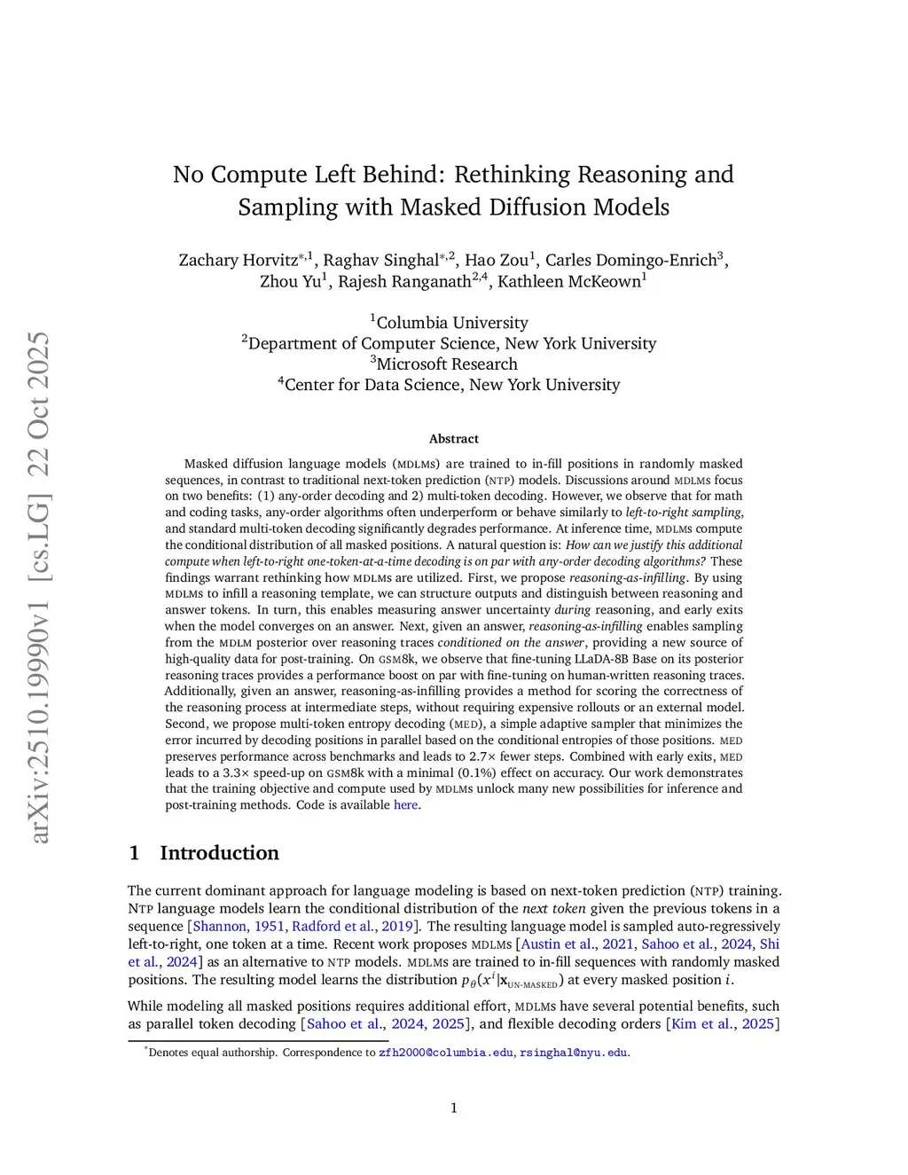 Masked diffusion language models (MDLMs) are trained to in-fill positions in randomly masked sequences, in contrast to next-token prediction models. Discussions around MDLMs focus on two benefits: (1) any-order decoding and 2) multi-token decoding. However, we observe that for math and coding tasks, any-order algorithms often underperform or behave similarly to left-to-right sampling, and standard multi-token decoding significantly degrades performance. At inference time, MDLMs compute the conditional distribution of all masked positions. A natural question is: How can we justify this additional compute when left-to-right one-token-at-a-time decoding is on par with any-order decoding algorithms? First, we propose reasoning-as-infilling. By using MDLMs to infill a reasoning template, we can structure outputs and distinguish between reasoning and answer tokens. In turn, this enables measuring answer uncertainty during reasoning, and early exits when the model converges on an answer. Next, given an answer, reasoning-as-infilling enables sampling from the MDLM posterior over reasoning traces conditioned on the answer, providing a new source of high-quality data for post-training. On GSM8k, we observe that fine-tuning LLaDA-8B Base on its posterior reasoning traces provides a performance boost on par with fine-tuning on human-written reasoning traces. Additionally, given an answer, reasoning-as-infilling provides a method for scoring the correctness of the reasoning process at intermediate steps. Second, we propose multi-token entropy decoding (MED), a simple adaptive sampler that minimizes the error incurred by decoding positions in parallel based on the conditional entropies of those positions. MED preserves performance across benchmarks and leads to 2.7x fewer steps. Our work demonstrates that the training and compute used by MDLMs unlock many new inference and post-training methods.