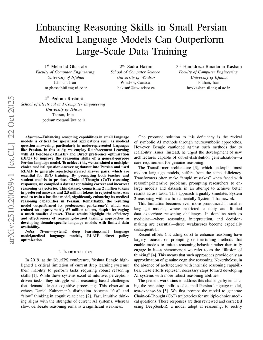 Enhancing reasoning capabilities in small language models is critical for specialized applications such as medical question answering, particularly in underrepresented languages like Persian. In this study, we employ Reinforcement Learning with AI Feedback (RLAIF) and Direct preference optimization (DPO) to improve the reasoning skills of a general-purpose Persian language model. To achieve this, we translated a multiple-choice medical question-answering dataset into Persian and used RLAIF to generate rejected-preferred answer pairs, which are essential for DPO training. By prompting both teacher and student models to produce Chain-of-Thought (CoT) reasoning responses, we compiled a dataset containing correct and incorrect reasoning trajectories. This dataset, comprising 2 million tokens in preferred answers and 2.5 million tokens in rejected ones, was used to train a baseline model, significantly enhancing its medical reasoning capabilities in Persian. Remarkably, the resulting model outperformed its predecessor, gaokerena-V, which was trained on approximately 57 million tokens, despite leveraging a much smaller dataset. These results highlight the efficiency and effectiveness of reasoning-focused training approaches in developing domain-specific language models with limited data availability.