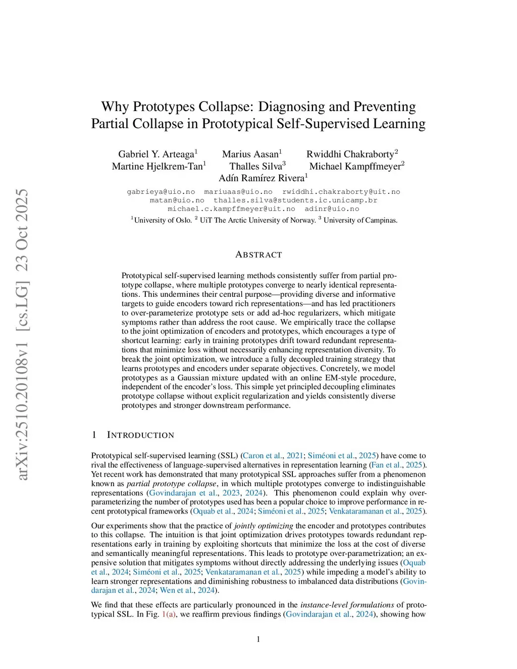 Prototypical self-supervised learning methods consistently suffer from partial prototype collapse, where multiple prototypes converge to nearly identical representations. This undermines their central purpose -- providing diverse and informative targets to guide encoders toward rich representations -- and has led practitioners to over-parameterize prototype sets or add ad-hoc regularizers, which mitigate symptoms rather than address the root cause. We empirically trace the collapse to the joint optimization of encoders and prototypes, which encourages a type of shortcut learning: early in training prototypes drift toward redundant representations that minimize loss without necessarily enhancing representation diversity. To break the joint optimization, we introduce a fully decoupled training strategy that learns prototypes and encoders under separate objectives. Concretely, we model prototypes as a Gaussian mixture updated with an online EM-style procedure, independent of the encoder's loss. This simple yet principled decoupling eliminates prototype collapse without explicit regularization and yields consistently diverse prototypes and stronger downstream performance.