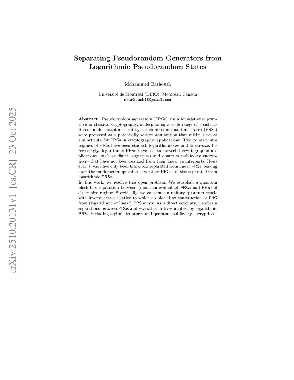 Pseudorandom generators (PRGs) are a foundational primitive in classical cryptography, underpinning a wide range of constructions. In the quantum setting, pseudorandom quantum states (PRSs) were proposed as a potentially weaker assumption that might serve as a substitute for PRGs in cryptographic applications. Two primary size regimes of PRSs have been studied: logarithmic-size and linear-size. Interestingly, logarithmic PRSs have led to powerful cryptographic applications, such as digital signatures and quantum public-key encryption with tamper-resilient keys, that have not been realized from their linear counterparts. However, PRGs have only been black-box separated from linear PRSs, leaving open the fundamental question of whether PRGs are also separated from logarithmic PRSs.In this work, we resolve this open problem. We establish a quantum black-box separation between (quantum-evaluable) PRGs and PRSs of either size regime. Specifically, we construct a unitary quantum oracle with inverse access relative to which no black-box construction of PRG from (logarithmic or linear) PRS exists.This does not directly separate PRG from some of the applications of SPRS since these applications involve, as a first step, a non-black-box construction of a notion termed bot-PRGs. To address this, we present another unitary separation showing that PRG are also separated from bot-PRGs. Thus, we obtain separation from digital signatures and quantum public-key encryption.