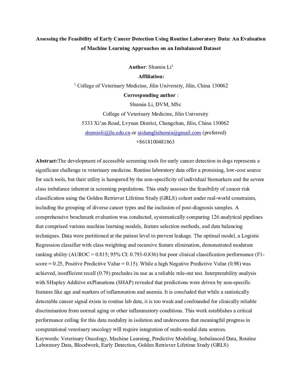 The development of accessible screening tools for early cancer detection in dogs represents a significant challenge in veterinary medicine. Routine laboratory data offer a promising, low-cost source for such tools, but their utility is hampered by the non-specificity of individual biomarkers and the severe class imbalance inherent in screening populations. This study assesses the feasibility of cancer risk classification using the Golden Retriever Lifetime Study (GRLS) cohort under real-world constraints, including the grouping of diverse cancer types and the inclusion of post-diagnosis samples. A comprehensive benchmark evaluation was conducted, systematically comparing 126 analytical pipelines that comprised various machine learning models, feature selection methods, and data balancing techniques. Data were partitioned at the patient level to prevent leakage. The optimal model, a Logistic Regression classifier with class weighting and recursive feature elimination, demonstrated moderate ranking ability (AUROC = 0.815; 95% CI: 0.793-0.836) but poor clinical classification performance (F1-score = 0.25, Positive Predictive Value = 0.15). While a high Negative Predictive Value (0.98) was achieved, insufficient recall (0.79) precludes its use as a reliable rule-out test. Interpretability analysis with SHapley Additive exPlanations (SHAP) revealed that predictions were driven by non-specific features like age and markers of inflammation and anemia. It is concluded that while a statistically detectable cancer signal exists in routine lab data, it is too weak and confounded for clinically reliable discrimination from normal aging or other inflammatory conditions. This work establishes a critical performance ceiling for this data modality in isolation and underscores that meaningful progress in computational veterinary oncology will require integration of multi-modal data sources.