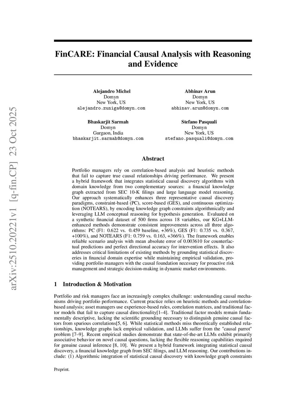 Portfolio managers rely on correlation-based analysis and heuristic methods that fail to capture true causal relationships driving performance. We present a hybrid framework that integrates statistical causal discovery algorithms with domain knowledge from two complementary sources: a financial knowledge graph extracted from SEC 10-K filings and large language model reasoning. Our approach systematically enhances three representative causal discovery paradigms, constraint-based (PC), score-based (GES), and continuous optimization (NOTEARS), by encoding knowledge graph constraints algorithmically and leveraging LLM conceptual reasoning for hypothesis generation. Evaluated on a synthetic financial dataset of 500 firms across 18 variables, our KG+LLM-enhanced methods demonstrate consistent improvements across all three algorithms: PC (F1: 0.622 vs. 0.459 baseline, +36%), GES (F1: 0.735 vs. 0.367, +100%), and NOTEARS (F1: 0.759 vs. 0.163, +366%). The framework enables reliable scenario analysis with mean absolute error of 0.003610 for counterfactual predictions and perfect directional accuracy for intervention effects. It also addresses critical limitations of existing methods by grounding statistical discoveries in financial domain expertise while maintaining empirical validation, providing portfolio managers with the causal foundation necessary for proactive risk management and strategic decision-making in dynamic market environments.