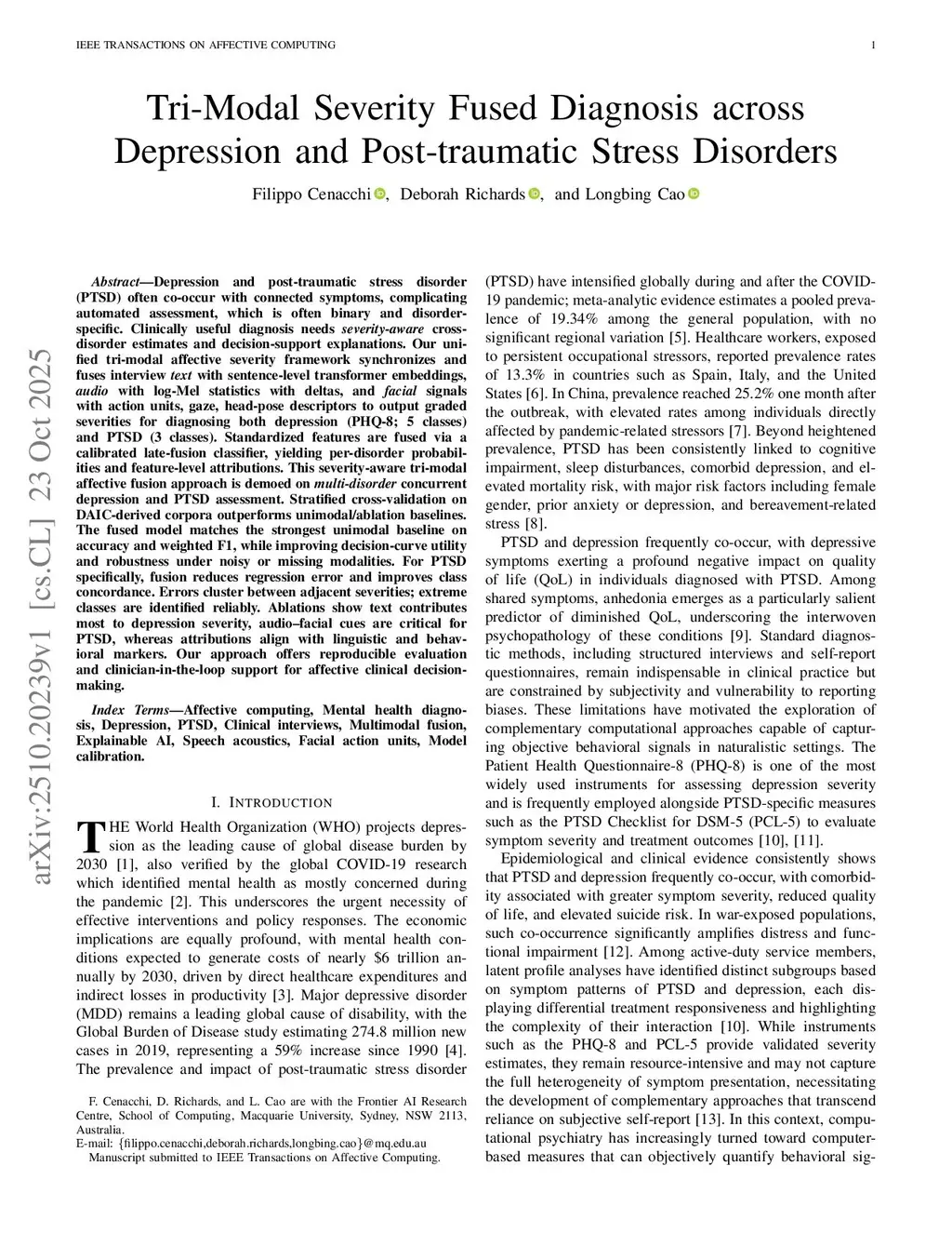Depression and post traumatic stress disorder (PTSD) often co-occur with connected symptoms, complicating automated assessment, which is often binary and disorder specific. Clinically useful diagnosis needs severity aware cross disorder estimates and decision support explanations. Our unified tri modal affective severity framework synchronizes and fuses interview text with sentence level transformer embeddings, audio with log Mel statistics with deltas, and facial signals with action units, gaze, head and pose descriptors to output graded severities for diagnosing both depression (PHQ-8; 5 classes) and PTSD (3 classes). Standardized features are fused via a calibrated late fusion classifier, yielding per disorder probabilities and feature-level attributions. This severity aware tri-modal affective fusion approach is demoed on multi disorder concurrent depression and PTSD assessment. Stratified cross validation on DAIC derived corpora outperforms unimodal/ablation baselines. The fused model matches the strongest unimodal baseline on accuracy and weighted F1, while improving decision curve utility and robustness under noisy or missing modalities. For PTSD specifically, fusion reduces regression error and improves class concordance. Errors cluster between adjacent severities; extreme classes are identified reliably. Ablations show text contributes most to depression severity, audio and facial cues are critical for PTSD, whereas attributions align with linguistic and behavioral markers. Our approach offers reproducible evaluation and clinician in the loop support for affective clinical decision making.