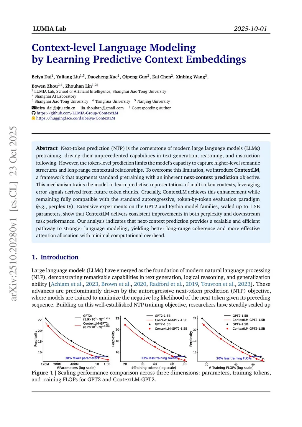 We propose ContextLM, a framework that implicitly learns multi-token prediction by augmenting standard pretraining with an intrinsic next-context prediction objective. ContextLM builds a language model on top of context embeddings that span multiple tokens, enabling better next-token prediction by predicting the next context. Our model is fully compatible with standard autoregressive, token-by-token evaluation paradigms (e.g., perplexity). Extensive experiments with GPT-2 and Pythia backbones (up to 1.5B parameters and 300B training tokens) reveal that ContextLM shifts the Pareto frontier of scaling laws, exhibiting superior efficiency in parameters, training tokens, and FLOPs. Our results show that ContextLM could already achieve the baseline perplexity using 39\% fewer parameters and demonstrates robust generalization improvements on extensive downstream tasks under equivalent parameter counts.