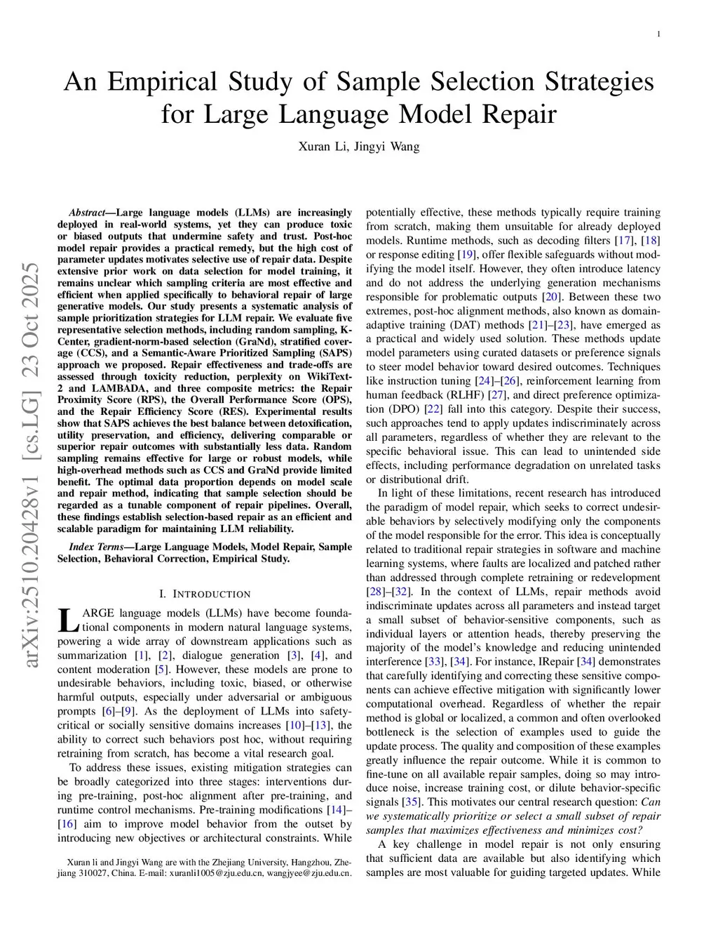 Large language models (LLMs) are increasingly deployed in real-world systems, yet they can produce toxic or biased outputs that undermine safety and trust. Post-hoc model repair provides a practical remedy, but the high cost of parameter updates motivates selective use of repair data. Despite extensive prior work on data selection for model training, it remains unclear which sampling criteria are most effective and efficient when applied specifically to behavioral repair of large generative models. Our study presents a systematic analysis of sample prioritization strategies for LLM repair. We evaluate five representative selection methods, including random sampling, K-Center, gradient-norm-based selection(GraNd), stratified coverage (CCS), and a Semantic-Aware Prioritized Sampling (SAPS) approach we proposed. Repair effectiveness and trade-offs are assessed through toxicity reduction, perplexity on WikiText-2 and LAMBADA, and three composite metrics: the Repair Proximity Score (RPS), the Overall Performance Score (OPS), and the Repair Efficiency Score (RES). Experimental results show that SAPS achieves the best balance between detoxification, utility preservation, and efficiency, delivering comparable or superior repair outcomes with substantially less data. Random sampling remains effective for large or robust models, while high-overhead methods such as CCS and GraNd provide limited benefit. The optimal data proportion depends on model scale and repair method, indicating that sample selection should be regarded as a tunable component of repair pipelines. Overall, these findings establish selection-based repair as an efficient and scalable paradigm for maintaining LLM reliability.