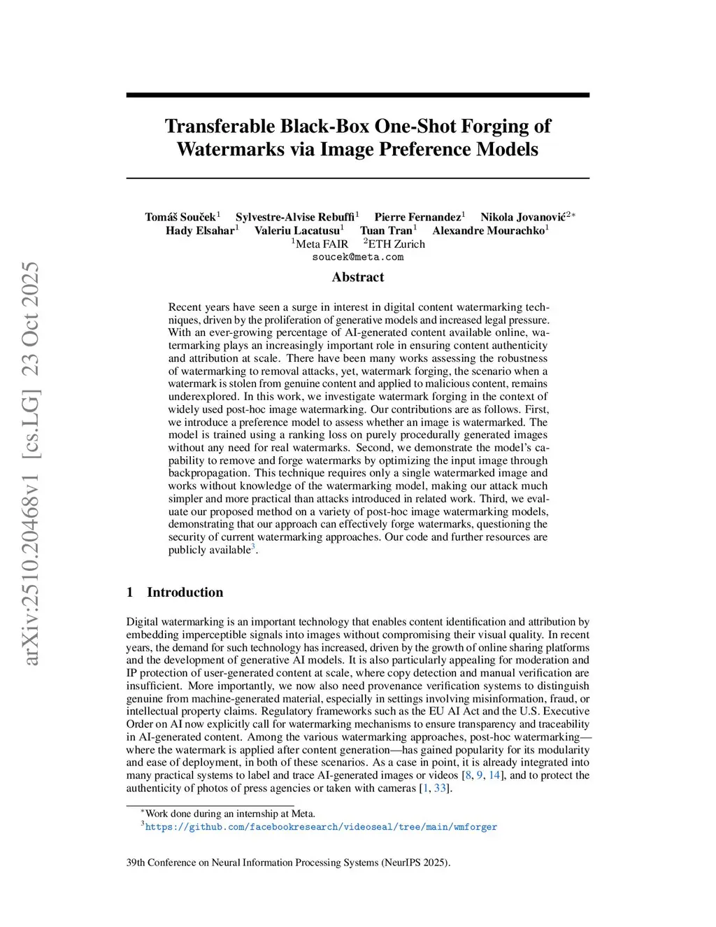 Recent years have seen a surge in interest in digital content watermarking techniques, driven by the proliferation of generative models and increased legal pressure. With an ever-growing percentage of AI-generated content available online, watermarking plays an increasingly important role in ensuring content authenticity and attribution at scale. There have been many works assessing the robustness of watermarking to removal attacks, yet, watermark forging, the scenario when a watermark is stolen from genuine content and applied to malicious content, remains underexplored. In this work, we investigate watermark forging in the context of widely used post-hoc image watermarking. Our contributions are as follows. First, we introduce a preference model to assess whether an image is watermarked. The model is trained using a ranking loss on purely procedurally generated images without any need for real watermarks. Second, we demonstrate the model's capability to remove and forge watermarks by optimizing the input image through backpropagation. This technique requires only a single watermarked image and works without knowledge of the watermarking model, making our attack much simpler and more practical than attacks introduced in related work. Third, we evaluate our proposed method on a variety of post-hoc image watermarking models, demonstrating that our approach can effectively forge watermarks, questioning the security of current watermarking approaches. Our code and further resources are publicly available.