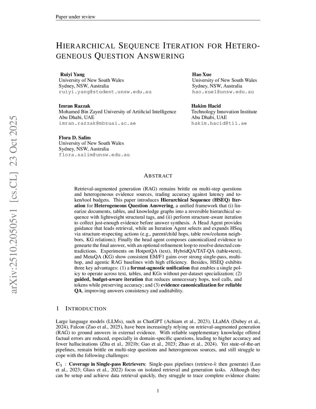 Retrieval-augmented generation (RAG) remains brittle on multi-step questions and heterogeneous evidence sources, trading accuracy against latency and token/tool budgets. This paper introducesHierarchical Sequence (HSEQ) Iteration for Heterogeneous Question Answering, a unified framework that (i) linearize documents, tables, and knowledge graphs into a reversible hierarchical sequence with lightweight structural tags, and (ii) perform structure-aware iteration to collect just-enough evidence before answer synthesis. A Head Agent provides guidance that leads retrieval, while an Iteration Agent selects and expands HSeq via structure-respecting actions (e.g., parent/child hops, table row/column neighbors, KG relations); Finally the head agent composes canonicalized evidence to genearte the final answer, with an optional refinement loop to resolve detected contradictions. Experiments on HotpotQA (text), HybridQA/TAT-QA (table+text), and MetaQA (KG) show consistent EM/F1 gains over strong single-pass, multi-hop, and agentic RAG baselines with high efficiency. Besides, HSEQ exhibits three key advantages: (1) a format-agnostic unification that enables a single policy to operate across text, tables, and KGs without per-dataset specialization; (2) guided, budget-aware iteration that reduces unnecessary hops, tool calls, and tokens while preserving accuracy; and (3) evidence canonicalization for reliable QA, improving answers consistency and auditability.