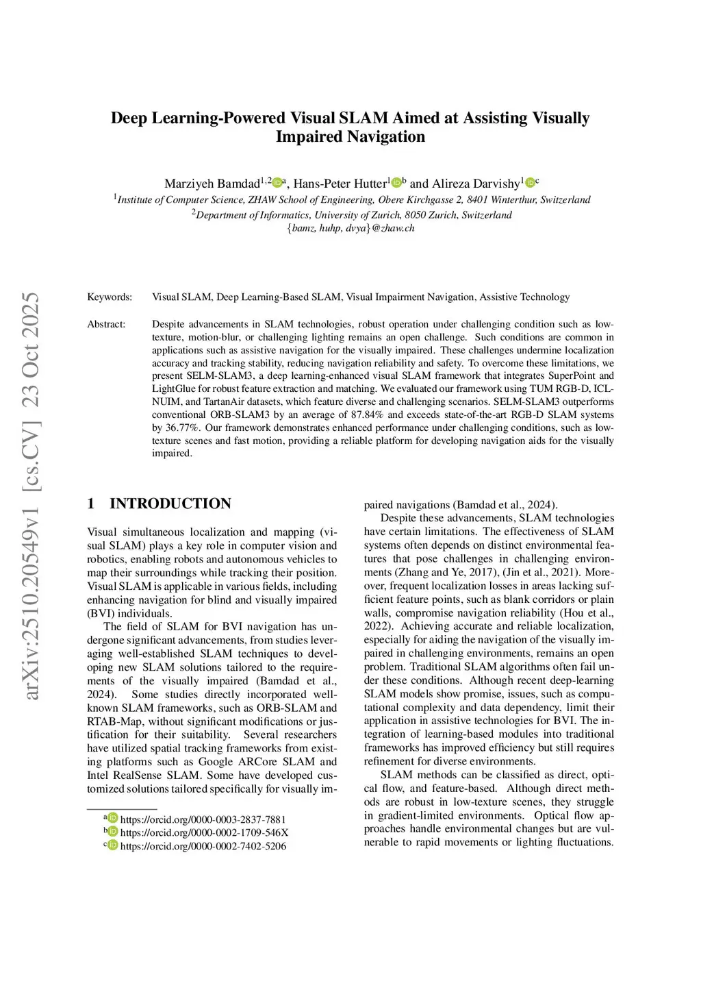 Deep Learning-Powered Visual SLAM Aimed at Assisting Visually Impaired Navigation