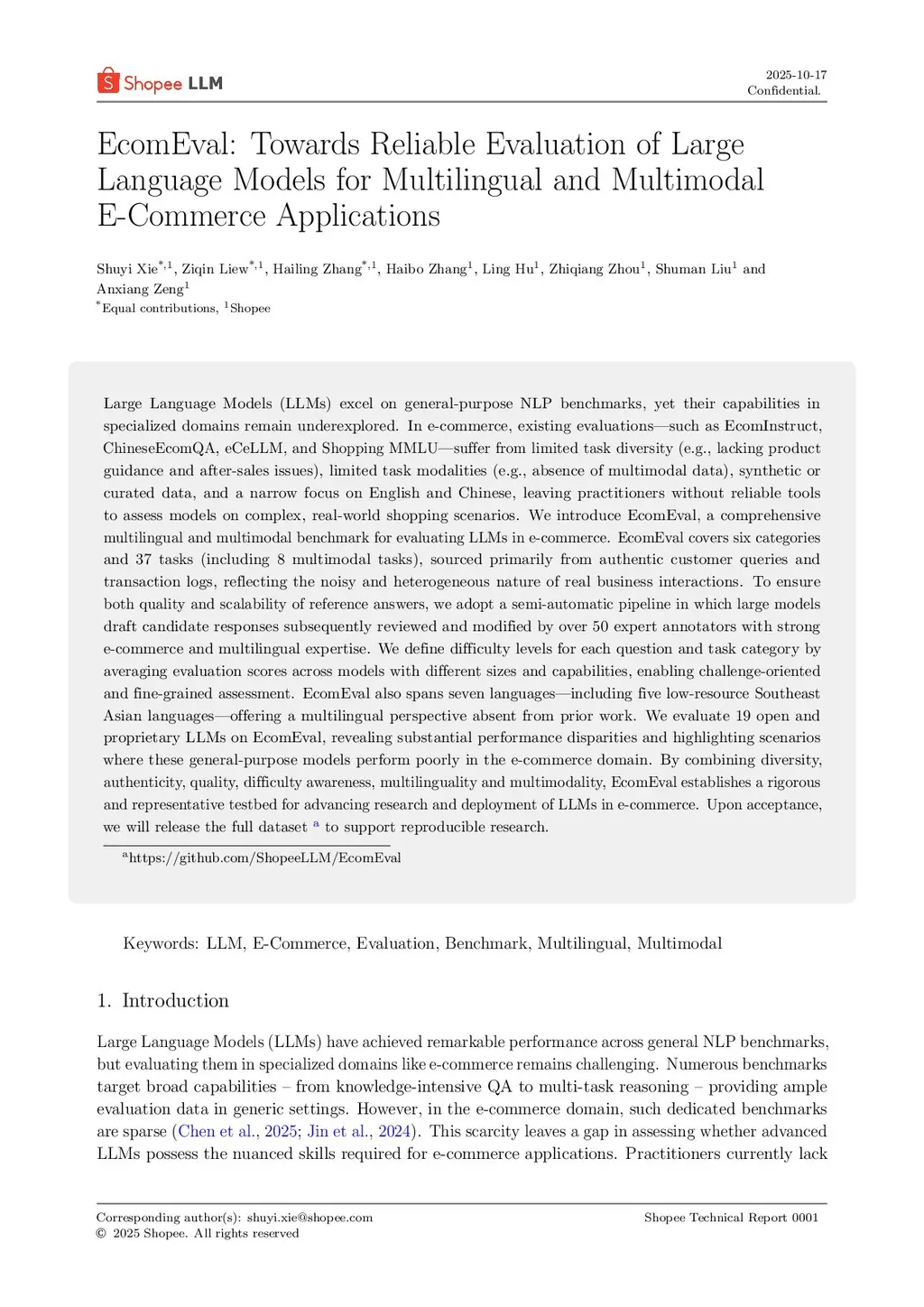 Large Language Models (LLMs) excel on general-purpose NLP benchmarks, yet their capabilities in specialized domains remain underexplored. In e-commerce, existing evaluations-such as EcomInstruct, ChineseEcomQA, eCeLLM, and Shopping MMLU-suffer from limited task diversity (e.g., lacking product guidance and after-sales issues), limited task modalities (e.g., absence of multimodal data), synthetic or curated data, and a narrow focus on English and Chinese, leaving practitioners without reliable tools to assess models on complex, real-world shopping scenarios. We introduce EcomEval, a comprehensive multilingual and multimodal benchmark for evaluating LLMs in e-commerce. EcomEval covers six categories and 37 tasks (including 8 multimodal tasks), sourced primarily from authentic customer queries and transaction logs, reflecting the noisy and heterogeneous nature of real business interactions. To ensure both quality and scalability of reference answers, we adopt a semi-automatic pipeline in which large models draft candidate responses subsequently reviewed and modified by over 50 expert annotators with strong e-commerce and multilingual expertise. We define difficulty levels for each question and task category by averaging evaluation scores across models with different sizes and capabilities, enabling challenge-oriented and fine-grained assessment. EcomEval also spans seven languages-including five low-resource Southeast Asian languages-offering a multilingual perspective absent from prior work.
