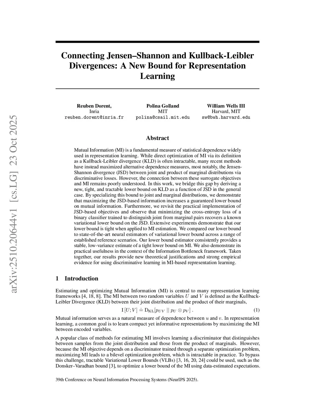 Mutual Information (MI) is a fundamental measure of statistical dependence widely used in representation learning. While direct optimization of MI via its definition as a Kullback-Leibler divergence (KLD) is often intractable, many recent methods have instead maximized alternative dependence measures, most notably, the Jensen-Shannon divergence (JSD) between joint and product of marginal distributions via discriminative losses. However, the connection between these surrogate objectives and MI remains poorly understood. In this work, we bridge this gap by deriving a new, tight, and tractable lower bound on KLD as a function of JSD in the general case. By specializing this bound to joint and marginal distributions, we demonstrate that maximizing the JSD-based information increases a guaranteed lower bound on mutual information. Furthermore, we revisit the practical implementation of JSD-based objectives and observe that minimizing the cross-entropy loss of a binary classifier trained to distinguish joint from marginal pairs recovers a known variational lower bound on the JSD. Extensive experiments demonstrate that our lower bound is tight when applied to MI estimation. We compared our lower bound to state-of-the-art neural estimators of variational lower bound across a range of established reference scenarios. Our lower bound estimator consistently provides a stable, low-variance estimate of a tight lower bound on MI. We also demonstrate its practical usefulness in the context of the Information Bottleneck framework. Taken together, our results provide new theoretical justifications and strong empirical evidence for using discriminative learning in MI-based representation learning.