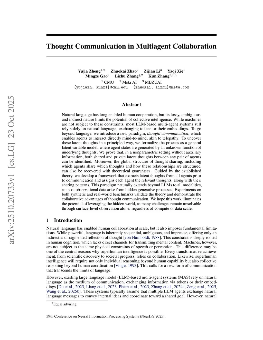 Natural language has long enabled human cooperation, but its lossy, ambiguous, and indirect nature limits the potential of collective intelligence. While machines are not subject to these constraints, most LLM-based multi-agent systems still rely solely on natural language, exchanging tokens or their embeddings. To go beyond language, we introduce a new paradigm, thought communication, which enables agents to interact directly mind-to-mind, akin to telepathy. To uncover these latent thoughts in a principled way, we formalize the process as a general latent variable model, where agent states are generated by an unknown function of underlying thoughts. We prove that, in a nonparametric setting without auxiliary information, both shared and private latent thoughts between any pair of agents can be identified. Moreover, the global structure of thought sharing, including which agents share which thoughts and how these relationships are structured, can also be recovered with theoretical guarantees. Guided by the established theory, we develop a framework that extracts latent thoughts from all agents prior to communication and assigns each agent the relevant thoughts, along with their sharing patterns. This paradigm naturally extends beyond LLMs to all modalities, as most observational data arise from hidden generative processes. Experiments on both synthetic and real-world benchmarks validate the theory and demonstrate the collaborative advantages of thought communication. We hope this work illuminates the potential of leveraging the hidden world, as many challenges remain unsolvable through surface-level observation alone, regardless of compute or data scale.