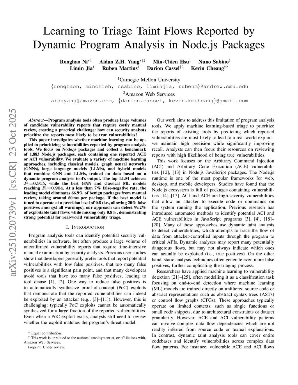 Program analysis tools often produce large volumes of candidate vulnerability reports that require costly manual review, creating a practical challenge: how can security analysts prioritize the reports most likely to be true vulnerabilities?This paper investigates whether machine learning can be applied to prioritizing vulnerabilities reported by program analysis tools. We focus onthis http URLpackages and collect a benchmark of 1,883this http URLpackages, each containing one reported ACE or ACI vulnerability. We evaluate a variety of machine learning approaches, including classical models, graph neural networks (GNNs), large language models (LLMs), and hybrid models that combine GNN and LLMs, trained on data based on a dynamic program analysis tool's output. The top LLM achieves , while the best GNN and classical ML models reaching . At a less than 7% false-negative rate, the leading model eliminates 66.9% of benign packages from manual review, taking around 60 ms per package. If the best model is tuned to operate at a precision level of 0.8 (i.e., allowing 20% false positives amongst all warnings), our approach can detect 99.2% of exploitable taint flows while missing only 0.8%, demonstrating strong potential for real-world vulnerability triage.