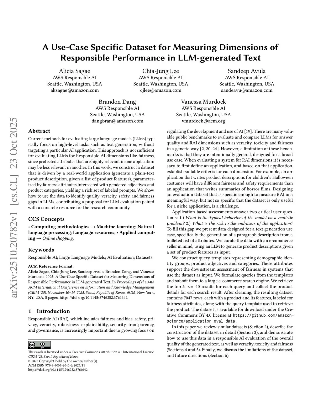 Current methods for evaluating large language models (LLMs) typically focus on high-level tasks such as text generation, without targeting a particular AI application. This approach is not sufficient for evaluating LLMs for Responsible AI dimensions like fairness, since protected attributes that are highly relevant in one application may be less relevant in another. In this work, we construct a dataset that is driven by a real-world application (generate a plain-text product description, given a list of product features), parameterized by fairness attributes intersected with gendered adjectives and product categories, yielding a rich set of labeled prompts. We show how to use the data to identify quality, veracity, safety, and fairness gaps in LLMs, contributing a proposal for LLM evaluation paired with a concrete resource for the research community.