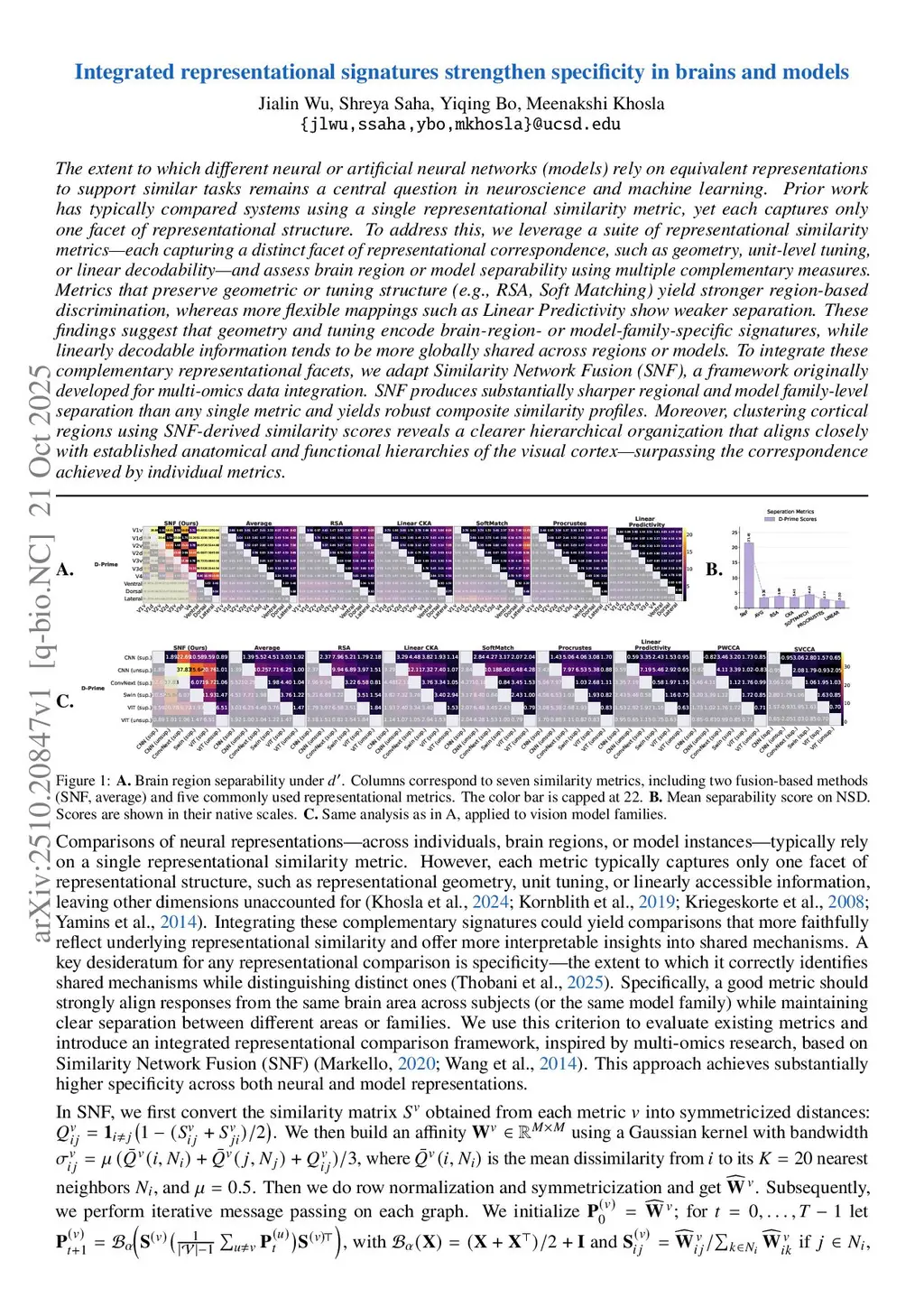 The extent to which different neural or artificial neural networks (models) rely on equivalent representations to support similar tasks remains a central question in neuroscience and machine learning. Prior work has typically compared systems using a single representational similarity metric, yet each captures only one facet of representational structure. To address this, we leverage a suite of representational similarity metrics-each capturing a distinct facet of representational correspondence, such as geometry, unit-level tuning, or linear decodability-and assess brain region or model separability using multiple complementary measures. Metrics that preserve geometric or tuning structure (e.g., RSA, Soft Matching) yield stronger region-based discrimination, whereas more flexible mappings such as Linear Predictivity show weaker separation. These findings suggest that geometry and tuning encode brain-region- or model-family-specific signatures, while linearly decodable information tends to be more globally shared across regions or models. To integrate these complementary representational facets, we adapt Similarity Network Fusion (SNF), a framework originally developed for multi-omics data integration. SNF produces substantially sharper regional and model family-level separation than any single metric and yields robust composite similarity profiles. Moreover, clustering cortical regions using SNF-derived similarity scores reveals a clearer hierarchical organization that aligns closely with established anatomical and functional hierarchies of the visual cortex-surpassing the correspondence achieved by individual metrics.