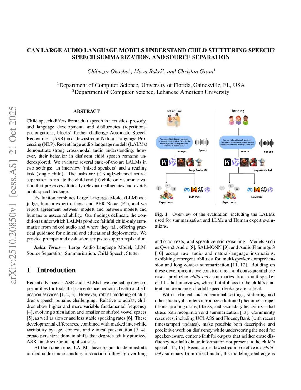 Child speech differs from adult speech in acoustics, prosody, and language development, and disfluencies (repetitions, prolongations, blocks) further challenge Automatic Speech Recognition (ASR) and downstream Natural Language Processing (NLP). Recent large audio-language models (LALMs) demonstrate strong cross-modal audio understanding; however, their behavior in disfluent child speech remains underexplored. We evaluate several state-of-the-art LALMs in two settings: an interview (mixed speakers) and a reading task (single child). The tasks are (i) single-channel source separation to isolate the child and (ii) child-only summarization that preserves clinically relevant disfluencies and avoids adult-speech leakage.Evaluation combines Large Language Model (LLM) as a judge, human expert ratings, and BERTScore (F1), and we report agreement between models and between models and humans to assess reliability. Our findings delineate the conditions under which LALMs produce faithful child-only summaries from mixed audio and where they fail, offering practical guidance for clinical and educational deployments. We provide prompts and evaluation scripts to support replication.