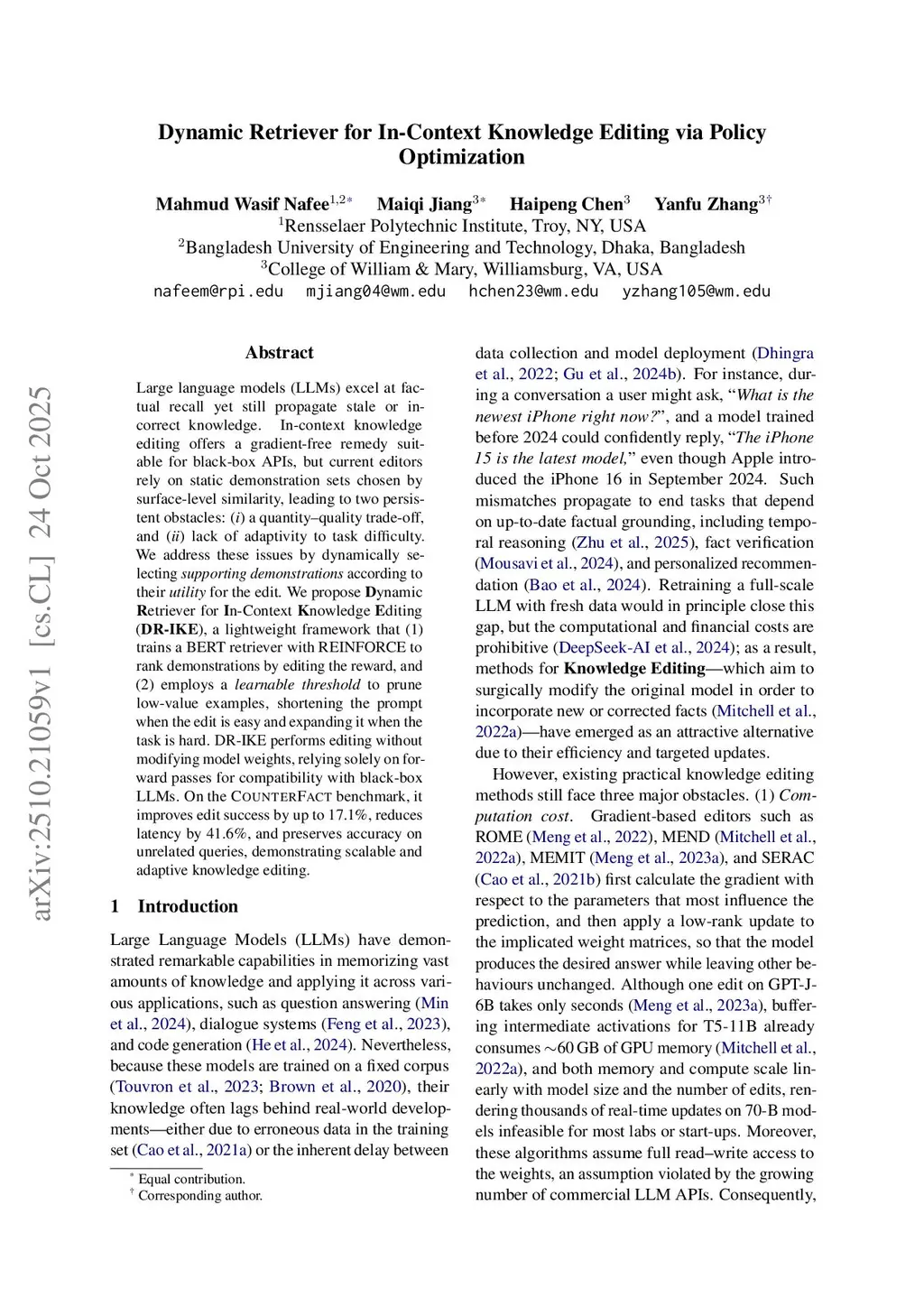Large language models (LLMs) excel at factual recall yet still propagate stale or incorrect knowledge. In-context knowledge editing offers a gradient-free remedy suitable for black-box APIs, but current editors rely on static demonstration sets chosen by surface-level similarity, leading to two persistent obstacles: (i) a quantity-quality trade-off, and (ii) lack of adaptivity to task difficulty. We address these issues by dynamically selecting supporting demonstrations according to their utility for the edit. We propose Dynamic Retriever for In-Context Knowledge Editing (DR-IKE), a lightweight framework that (1) trains a BERT retriever with REINFORCE to rank demonstrations by editing reward, and (2) employs a learnable threshold to prune low-value examples, shortening the prompt when the edit is easy and expanding it when the task is hard. DR-IKE performs editing without modifying model weights, relying solely on forward passes for compatibility with black-box LLMs. On the COUNTERFACT benchmark, it improves edit success by up to 17.1%, reduces latency by 41.6%, and preserves accuracy on unrelated queries, demonstrating scalable and adaptive knowledge editing. The code is available atthis https URL.
