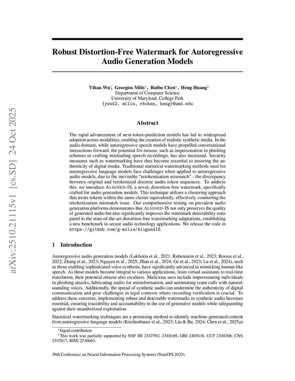 The rapid advancement of next-token-prediction models has led to widespread adoption across modalities, enabling the creation of realistic synthetic media. In the audio domain, while autoregressive speech models have propelled conversational interactions forward, the potential for misuse, such as impersonation in phishing schemes or crafting misleading speech recordings, has also increased. Security measures such as watermarking have thus become essential to ensuring the authenticity of digital media. Traditional statistical watermarking methods used for autoregressive language models face challenges when applied to autoregressive audio models, due to the inevitable ``retokenization mismatch'' - the discrepancy between original and retokenized discrete audio token sequences. To address this, we introduce Aligned-IS, a novel, distortion-free watermark, specifically crafted for audio generation models. This technique utilizes a clustering approach that treats tokens within the same cluster equivalently, effectively countering the retokenization mismatch issue. Our comprehensive testing on prevalent audio generation platforms demonstrates that Aligned-IS not only preserves the quality of generated audio but also significantly improves the watermark detectability compared to the state-of-the-art distortion-free watermarking adaptations, establishing a new benchmark in secure audio technology applications.