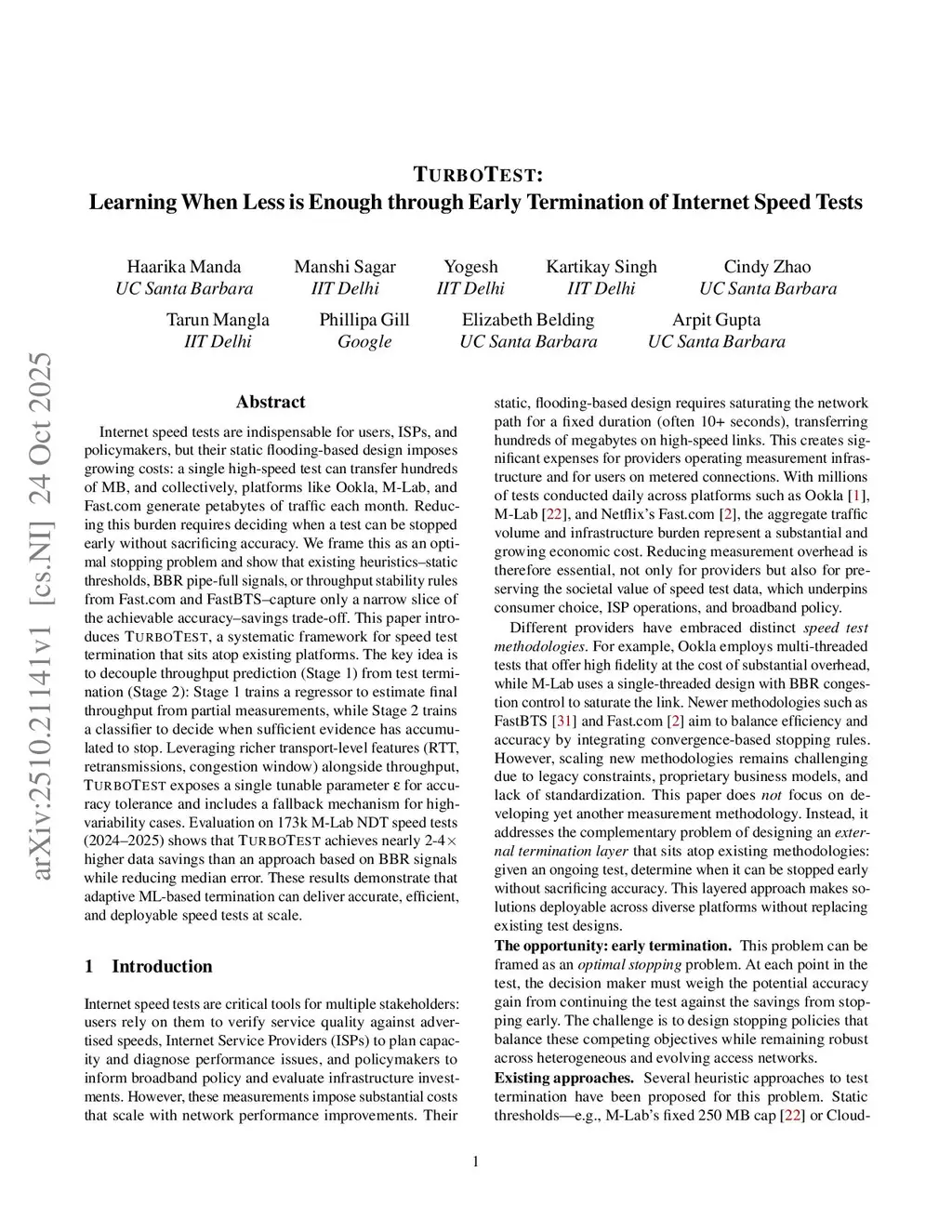 Internet speed tests are indispensable for users, ISPs, and policymakers, but their static flooding-based design imposes growing costs: a single high-speed test can transfer hundreds of megabytes, and collectively, platforms like Ookla, M-Lab, andthis http URLgenerate petabytes of traffic each month. Reducing this burden requires deciding when a test can be stopped early without sacrificing accuracy. We frame this as an optimal stopping problem and show that existing heuristics-static thresholds, BBR pipe-full signals, or throughput stability rules fromthis http URLand FastBTS-capture only a narrow portion of the achievable accuracy-savings trade-off. This paper introduces TURBOTEST, a systematic framework for speed test termination that sits atop existing platforms. The key idea is to decouple throughput prediction (Stage 1) from test termination (Stage 2): Stage 1 trains a regressor to estimate final throughput from partial measurements, while Stage 2 trains a classifier to decide when sufficient evidence has accumulated to stop. Leveraging richer transport-level features (RTT, retransmissions, congestion window) alongside throughput, TURBOTEST exposes a single tunable parameter for accuracy tolerance and includes a fallback mechanism for high-variability cases. Evaluation on 173,000 M-Lab NDT speed tests (2024-2025) shows that TURBOTEST achieves nearly 2-4x higher data savings than an approach based on BBR signals while reducing median error. These results demonstrate that adaptive ML-based termination can deliver accurate, efficient, and deployable speed tests at scale.