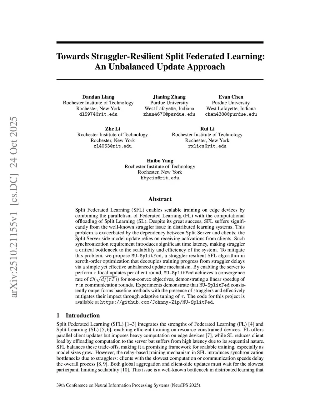 Split Federated Learning (SFL) enables scalable training on edge devices by combining the parallelism of Federated Learning (FL) with the computational offloading of Split Learning (SL). Despite its great success, SFL suffers significantly from the well-known straggler issue in distributed learning systems. This problem is exacerbated by the dependency between Split Server and clients: the Split Server side model update relies on receiving activations from clients. Such synchronization requirement introduces significant time latency, making straggler a critical bottleneck to the scalability and efficiency of the system. To mitigate this problem, we propose MU-SplitFed, a straggler-resilient SFL algorithm in zeroth-order optimization that decouples training progress from straggler delays via a simple yet effective unbalanced update mechanism.By enabling the server to perform local updates per client round, MU-SplitFed achieves a convergence rate of for non-convex objectives, demonstrating a linear speedup of in communication rounds. Experiments demonstrate that MU-SplitFed consistently outperforms baseline methods with the presence of stragglers and effectively mitigates their impact through adaptive tuning of . The code for this project is available atthis https URL.
