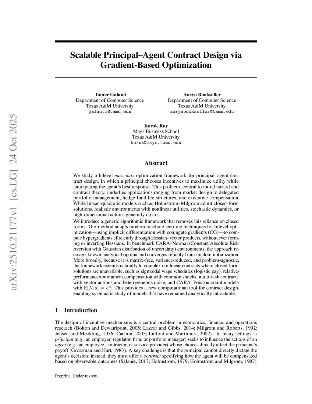 We study a bilevel \emph{max-max} optimization framework for principal-agent contract design, in which a principal chooses incentives to maximize utility while anticipating the agent's best response. This problem, central to moral hazard and contract theory, underlies applications ranging from market design to delegated portfolio management, hedge fund fee structures, and executive compensation. While linear-quadratic models such as Holmstr"om-Milgrom admit closed-form solutions, realistic environments with nonlinear utilities, stochastic dynamics, or high-dimensional actions generally do not.We introduce a generic algorithmic framework that removes this reliance on closed forms. Our method adapts modern machine learning techniques for bilevel optimization -- using implicit differentiation with conjugate gradients (CG) -- to compute hypergradients efficiently through Hessian-vector products, without ever forming or inverting Hessians. In benchmark CARA-Normal (Constant Absolute Risk Aversion with Gaussian distribution of uncertainty) environments, the approach recovers known analytical optima and converges reliably from random initialization. More broadly, because it is matrix-free, variance-reduced, and problem-agnostic, the framework extends naturally to complex nonlinear contracts where closed-form solutions are unavailable, such as sigmoidal wage schedules (logistic pay), relative-performance/tournament compensation with common shocks, multi-task contracts with vector actions and heterogeneous noise, and CARA-Poisson count models with . This provides a new computational tool for contract design, enabling systematic study of models that have remained analytically intractable.