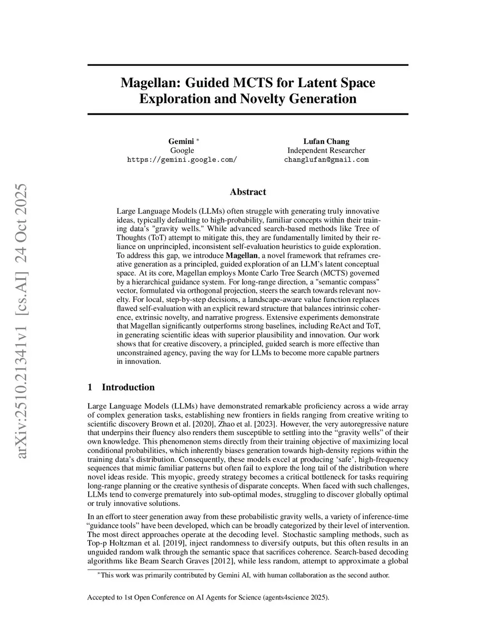 Large Language Models (LLMs) often struggle with generating truly innovative ideas, typically defaulting to high-probability, familiar concepts within their training data's "gravity wells." While advanced search-based methods like Tree of Thoughts (ToT) attempt to mitigate this, they are fundamentally limited by their reliance on unprincipled, inconsistent self-evaluation heuristics to guide exploration. To address this gap, we introduce \textbf{Magellan}, a novel framework that reframes creative generation as a principled, guided exploration of an LLM's latent conceptual space. At its core, Magellan employs Monte Carlo Tree Search (MCTS) governed by a hierarchical guidance system. For long-range direction, a "semantic compass" vector, formulated via orthogonal projection, steers the search towards relevant novelty. For local, step-by-step decisions, a landscape-aware value function replaces flawed self-evaluation with an explicit reward structure that balances intrinsic coherence, extrinsic novelty, and narrative progress. Extensive experiments demonstrate that Magellan significantly outperforms strong baselines, including ReAct and ToT, in generating scientific ideas with superior plausibility and innovation. Our work shows that for creative discovery, a principled, guided search is more effective than unconstrained agency, paving the way for LLMs to become more capable partners in innovation.