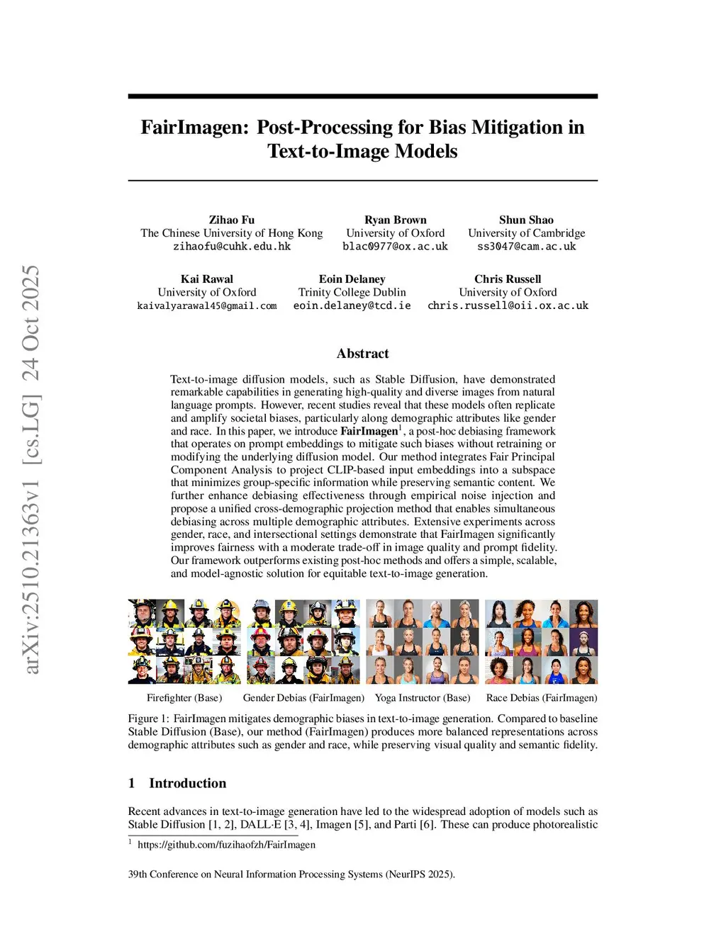 Text-to-image diffusion models, such as Stable Diffusion, have demonstrated remarkable capabilities in generating high-quality and diverse images from natural language prompts. However, recent studies reveal that these models often replicate and amplify societal biases, particularly along demographic attributes like gender and race. In this paper, we introduce FairImagen (this https URL), a post-hoc debiasing framework that operates on prompt embeddings to mitigate such biases without retraining or modifying the underlying diffusion model. Our method integrates Fair Principal Component Analysis to project CLIP-based input embeddings into a subspace that minimizes group-specific information while preserving semantic content. We further enhance debiasing effectiveness through empirical noise injection and propose a unified cross-demographic projection method that enables simultaneous debiasing across multiple demographic attributes. Extensive experiments across gender, race, and intersectional settings demonstrate that FairImagen significantly improves fairness with a moderate trade-off in image quality and prompt fidelity. Our framework outperforms existing post-hoc methods and offers a simple, scalable, and model-agnostic solution for equitable text-to-image generation.