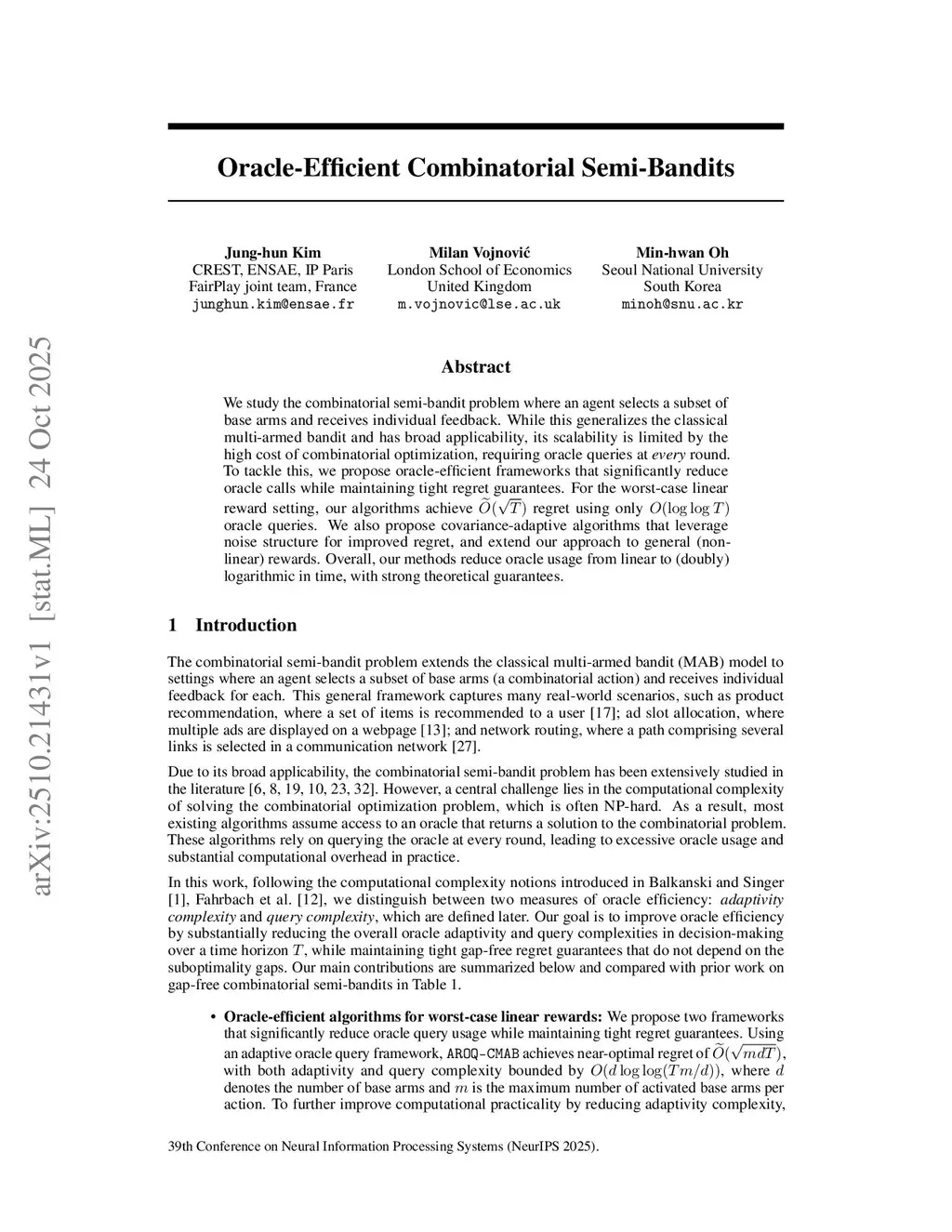We study the combinatorial semi-bandit problem where an agent selects a subset of base arms and receives individual feedback. While this generalizes the classical multi-armed bandit and has broad applicability, its scalability is limited by the high cost of combinatorial optimization, requiring oracle queries at every round. To tackle this, we propose oracle-efficient frameworks that significantly reduce oracle calls while maintaining tight regret guarantees. For the worst-case linear reward setting, our algorithms achieve regret using only oracle queries. We also propose covariance-adaptive algorithms that leverage noise structure for improved regret, and extend our approach to general (non-linear) rewards. Overall, our methods reduce oracle usage from linear to (doubly) logarithmic in time, with strong theoretical guarantees.