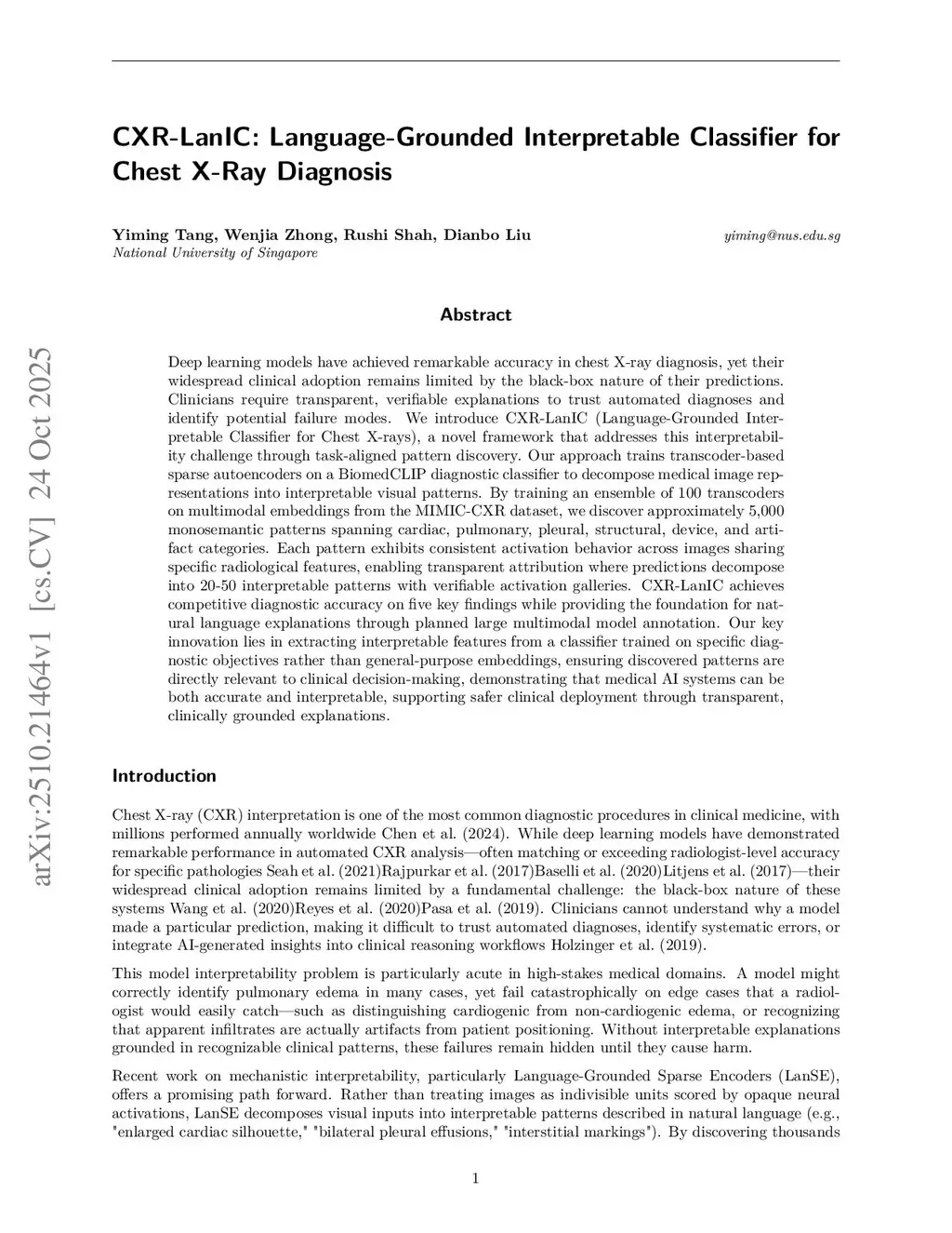 Deep learning models have achieved remarkable accuracy in chest X-ray diagnosis, yet their widespread clinical adoption remains limited by the black-box nature of their predictions. Clinicians require transparent, verifiable explanations to trust automated diagnoses and identify potential failure modes. We introduce CXR-LanIC (Language-Grounded Interpretable Classifier for Chest X-rays), a novel framework that addresses this interpretability challenge through task-aligned pattern discovery. Our approach trains transcoder-based sparse autoencoders on a BiomedCLIP diagnostic classifier to decompose medical image representations into interpretable visual patterns. By training an ensemble of 100 transcoders on multimodal embeddings from the MIMIC-CXR dataset, we discover approximately 5,000 monosemantic patterns spanning cardiac, pulmonary, pleural, structural, device, and artifact categories. Each pattern exhibits consistent activation behavior across images sharing specific radiological features, enabling transparent attribution where predictions decompose into 20-50 interpretable patterns with verifiable activation galleries. CXR-LanIC achieves competitive diagnostic accuracy on five key findings while providing the foundation for natural language explanations through planned large multimodal model annotation. Our key innovation lies in extracting interpretable features from a classifier trained on specific diagnostic objectives rather than general-purpose embeddings, ensuring discovered patterns are directly relevant to clinical decision-making, demonstrating that medical AI systems can be both accurate and interpretable, supporting safer clinical deployment through transparent, clinically grounded explanations.