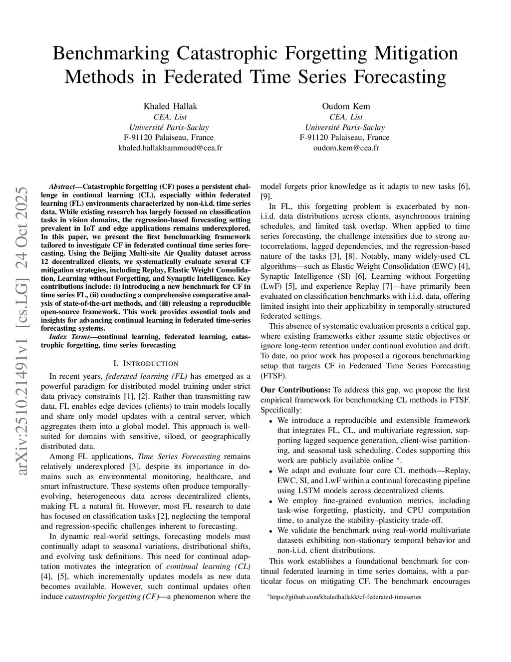Catastrophic forgetting (CF) poses a persistent challenge in continual learning (CL), especially within federated learning (FL) environments characterized by non-i.i.d. time series data. While existing research has largely focused on classification tasks in vision domains, the regression-based forecasting setting prevalent in IoT and edge applications remains underexplored. In this paper, we present the first benchmarking framework tailored to investigate CF in federated continual time series forecasting. Using the Beijing Multi-site Air Quality dataset across 12 decentralized clients, we systematically evaluate several CF mitigation strategies, including Replay, Elastic Weight Consolidation, Learning without Forgetting, and Synaptic Intelligence. Key contributions include: (i) introducing a new benchmark for CF in time series FL, (ii) conducting a comprehensive comparative analysis of state-of-the-art methods, and (iii) releasing a reproducible open-source framework. This work provides essential tools and insights for advancing continual learning in federated time-series forecasting systems.