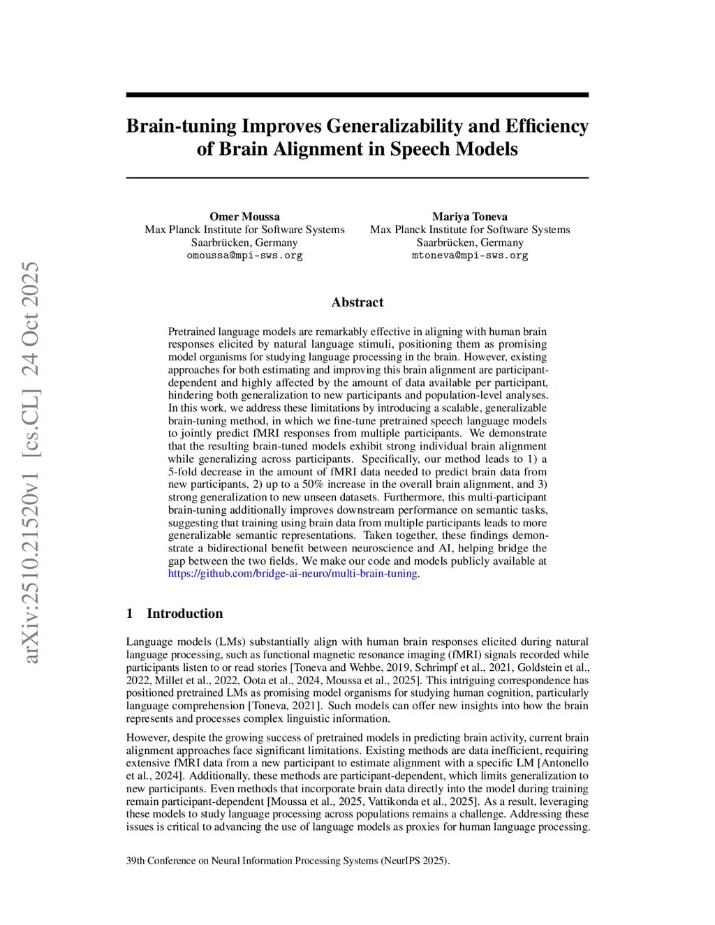 Pretrained language models are remarkably effective in aligning with human brain responses elicited by natural language stimuli, positioning them as promising model organisms for studying language processing in the brain. However, existing approaches for both estimating and improving this brain alignment are participant-dependent and highly affected by the amount of data available per participant, hindering both generalization to new participants and population-level analyses. In this work, we address these limitations by introducing a scalable, generalizable brain-tuning method, in which we fine-tune pretrained speech language models to jointly predict fMRI responses from multiple participants. We demonstrate that the resulting brain-tuned models exhibit strong individual brain alignment while generalizing across participants. Specifically, our method leads to 1) a 5-fold decrease in the amount of fMRI data needed to predict brain data from new participants, 2) up to a 50% increase in the overall brain alignment, and 3) strong generalization to new unseen datasets. Furthermore, this multi-participant brain-tuning additionally improves downstream performance on semantic tasks, suggesting that training using brain data from multiple participants leads to more generalizable semantic representations. Taken together, these findings demonstrate a bidirectional benefit between neuroscience and AI, helping bridge the gap between the two fields. We make our code and models publicly available atthis https URL.