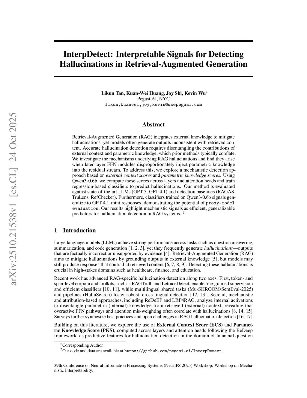 Retrieval-Augmented Generation (RAG) integrates external knowledge to mitigate hallucinations, yet models often generate outputs inconsistent with retrieved content. Accurate hallucination detection requires disentangling the contributions of external context and parametric knowledge, which prior methods typically conflate. We investigate the mechanisms underlying RAG hallucinations and find they arise when later-layer FFN modules disproportionately inject parametric knowledge into the residual stream. To address this, we explore a mechanistic detection approach based on external context scores and parametric knowledge scores. Using Qwen3-0.6b, we compute these scores across layers and attention heads and train regression-based classifiers to predict hallucinations. Our method is evaluated against state-of-the-art LLMs (GPT-5, GPT-4.1) and detection baselines (RAGAS, TruLens, RefChecker). Furthermore, classifiers trained on Qwen3-0.6b signals generalize to GPT-4.1-mini responses, demonstrating the potential of proxy-model evaluation. Our results highlight mechanistic signals as efficient, generalizable predictors for hallucination detection in RAG systems.