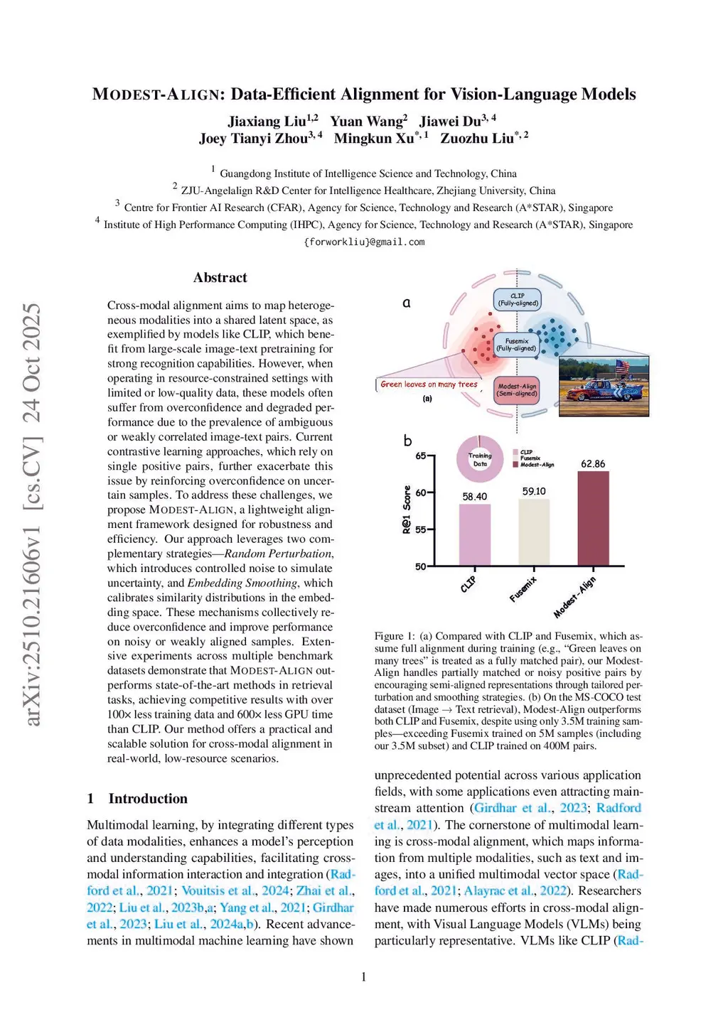 Cross-modal alignment aims to map heterogeneous modalities into a shared latent space, as exemplified by models like CLIP, which benefit from large-scale image-text pretraining for strong recognition capabilities. However, when operating in resource-constrained settings with limited or low-quality data, these models often suffer from overconfidence and degraded performance due to the prevalence of ambiguous or weakly correlated image-text pairs. Current contrastive learning approaches, which rely on single positive pairs, further exacerbate this issue by reinforcing overconfidence on uncertain samples. To address these challenges, we propose Modest-Align, a lightweight alignment framework designed for robustness and efficiency. Our approach leverages two complementary strategies -- Random Perturbation, which introduces controlled noise to simulate uncertainty, and Embedding Smoothing, which calibrates similarity distributions in the embedding space. These mechanisms collectively reduce overconfidence and improve performance on noisy or weakly aligned samples. Extensive experiments across multiple benchmark datasets demonstrate that Modest-Align outperforms state-of-the-art methods in retrieval tasks, achieving competitive results with over 100x less training data and 600x less GPU time than CLIP. Our method offers a practical and scalable solution for cross-modal alignment in real-world, low-resource scenarios.