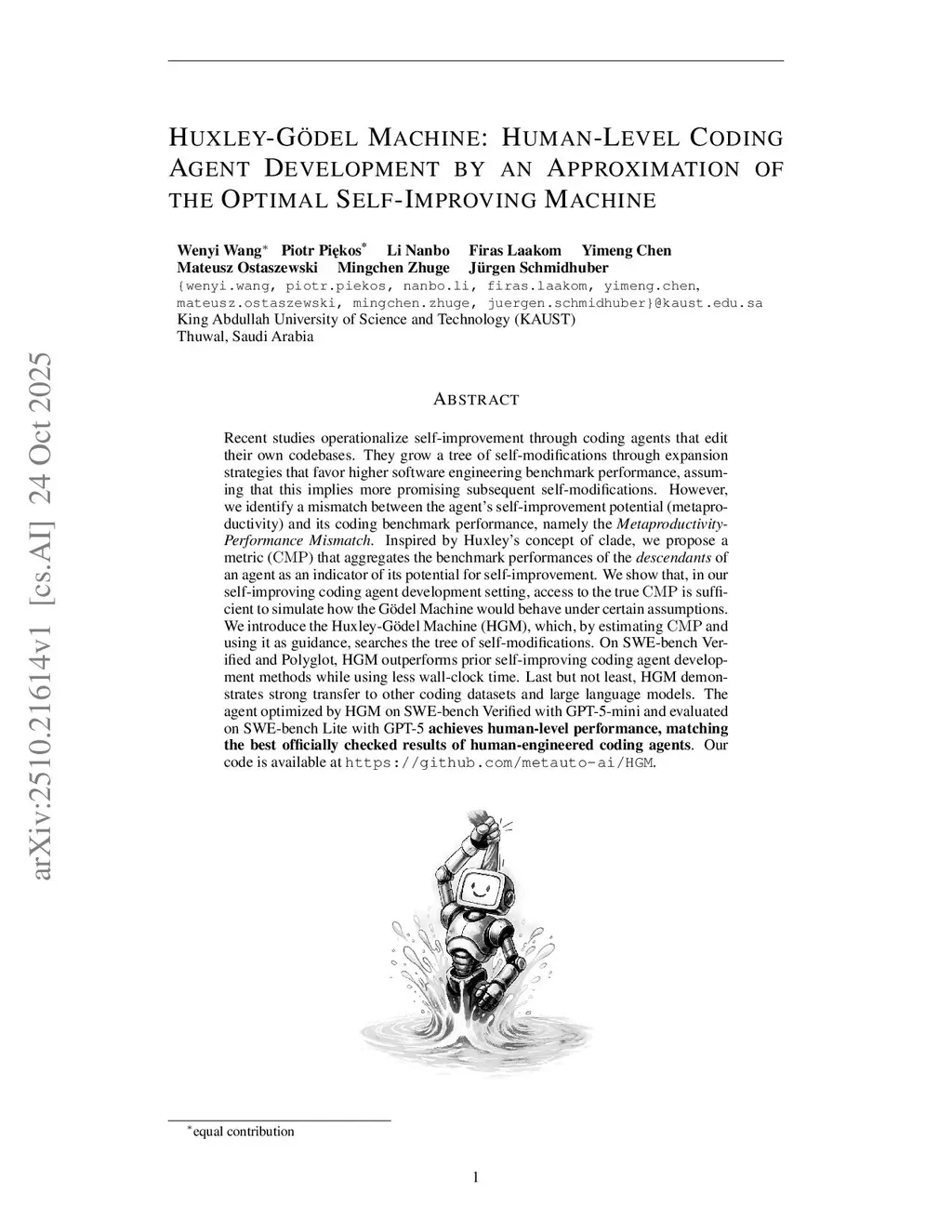 Recent studies operationalize self-improvement through coding agents that edit their own codebases. They grow a tree of self-modifications through expansion strategies that favor higher software engineering benchmark performance, assuming that this implies more promising subsequent self-modifications. However, we identify a mismatch between the agent's self-improvement potential (metaproductivity) and its coding benchmark performance, namely the Metaproductivity-Performance Mismatch. Inspired by Huxley's concept of clade, we propose a metric () that aggregates the benchmark performances of the descendants of an agent as an indicator of its potential for self-improvement. We show that, in our self-improving coding agent development setting, access to the true is sufficient to simulate how the Gödel Machine would behave under certain assumptions. We introduce the Huxley-Gödel Machine (HGM), which, by estimating and using it as guidance, searches the tree of self-modifications. On SWE-bench Verified and Polyglot, HGM outperforms prior self-improving coding agent development methods while using fewer allocated CPU hours. Last but not least, HGM demonstrates strong transfer to other coding datasets and large language models. The agent optimized by HGM on SWE-bench Verified with GPT-5-mini and evaluated on SWE-bench Lite with GPT-5 achieves human-level performance, matching the best officially checked results of human-engineered coding agents. Our code is publicly available atthis https URL.