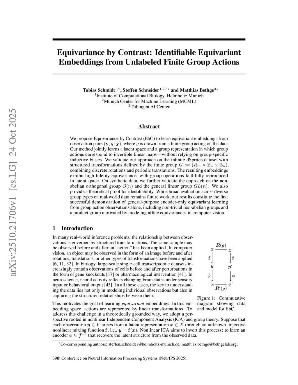 We propose Equivariance by Contrast (EbC) to learn equivariant embeddings from observation pairs , where is drawn from a finite group acting on the data. Our method jointly learns a latent space and a group representation in which group actions correspond to invertible linear maps -- without relying on group-specific inductive biases. We validate our approach on the infinite dSprites dataset with structured transformations defined by the finite group , combining discrete rotations and periodic translations. The resulting embeddings exhibit high-fidelity equivariance, with group operations faithfully reproduced in latent space. On synthetic data, we further validate the approach on the non-abelian orthogonal group and the general linear group . We also provide a theoretical proof for identifiability. While broad evaluation across diverse group types on real-world data remains future work, our results constitute the first successful demonstration of general-purpose encoder-only equivariant learning from group action observations alone, including non-trivial non-abelian groups and a product group motivated by modeling affine equivariances in computer vision.