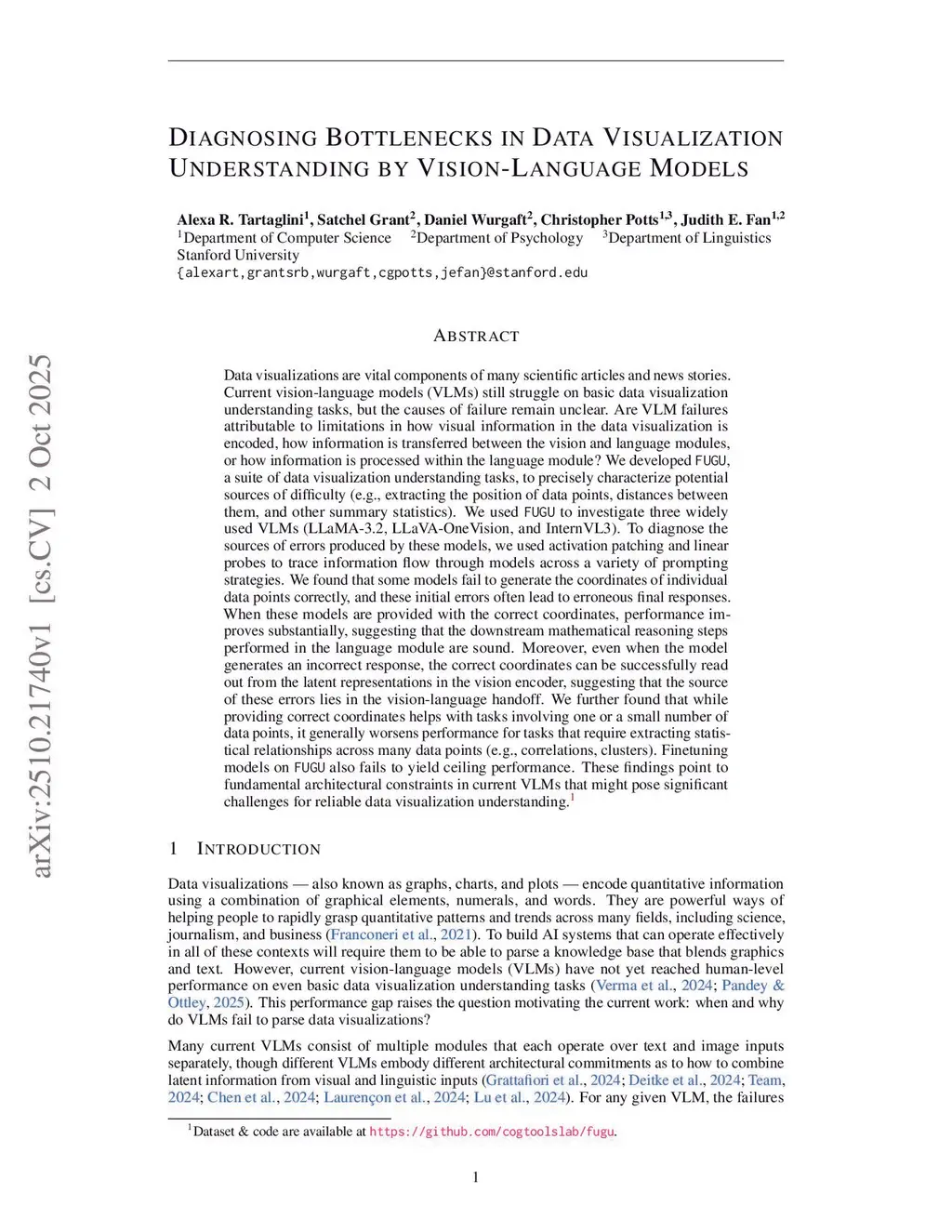 Data visualizations are vital components of many scientific articles and news stories. Current vision-language models (VLMs) still struggle on basic data visualization understanding tasks, but the causes of failure remain unclear. Are VLM failures attributable to limitations in how visual information in the data visualization is encoded, how information is transferred between the vision and language modules, or how information is processed within the language module? We developed FUGU, a suite of data visualization understanding tasks, to precisely characterize potential sources of difficulty (e.g., extracting the position of data points, distances between them, and other summary statistics). We used FUGU to investigate three widely used VLMs. To diagnose the sources of errors produced by these models, we used activation patching and linear probes to trace information flow through models across a variety of prompting strategies. We found that some models fail to generate the coordinates of individual data points correctly, and these initial errors often lead to erroneous final responses. When these models are provided with the correct coordinates, performance improves substantially. Moreover, even when the model generates an incorrect response, the correct coordinates can be successfully read out from the latent representations in the vision encoder, suggesting that the source of these errors lies in the vision-language handoff. We further found that while providing correct coordinates helps with tasks involving one or a small number of data points, it generally worsens performance for tasks that require extracting statistical relationships across many data points. Fine-tuning models on FUGU also fails to yield ceiling performance. These findings point to architectural constraints in current VLMs that might pose significant challenges for reliable data visualization understanding.