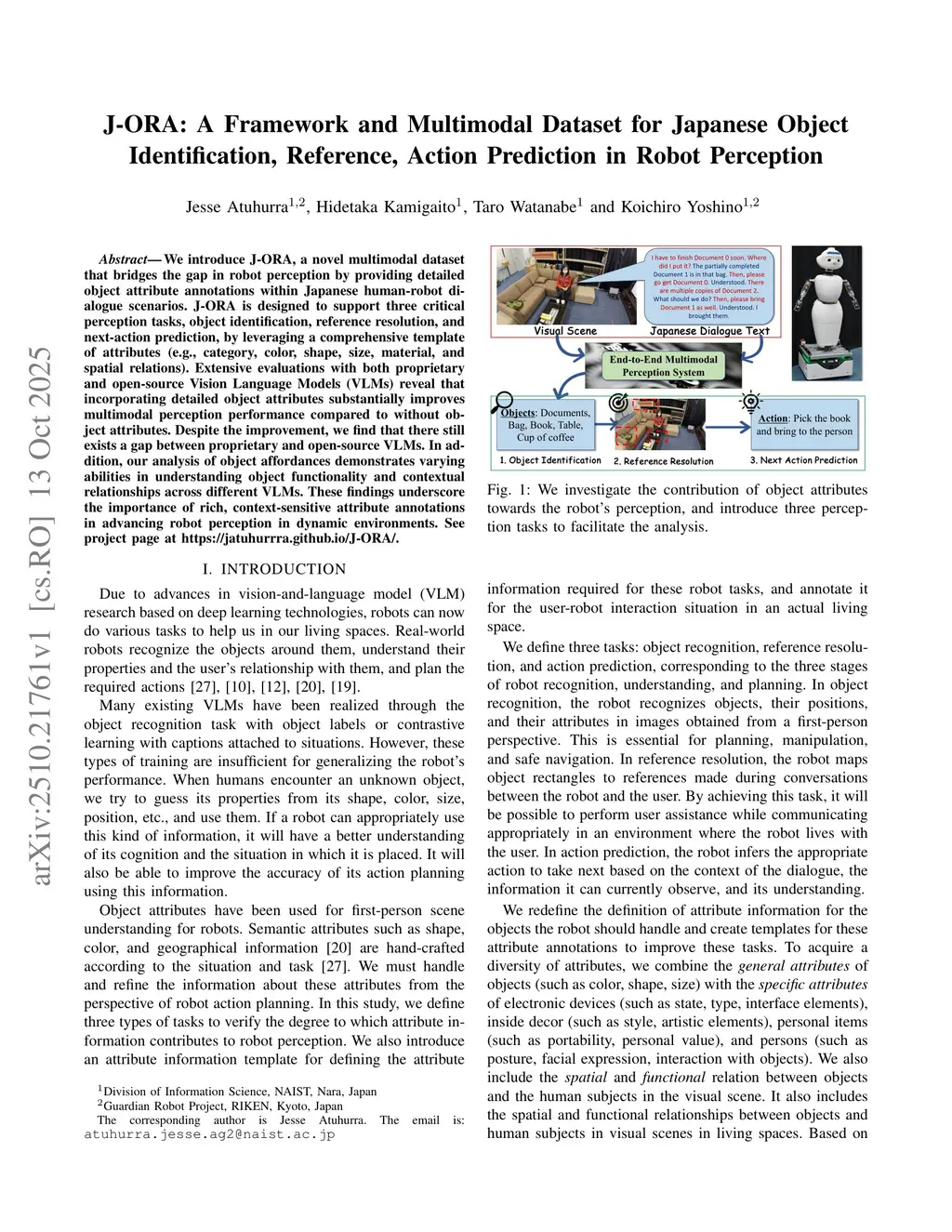 We introduce J-ORA, a novel multimodal dataset that bridges the gap in robot perception by providing detailed object attribute annotations within Japanese human-robot dialogue scenarios. J-ORA is designed to support three critical perception tasks, object identification, reference resolution, and next-action prediction, by leveraging a comprehensive template of attributes (e.g., category, color, shape, size, material, and spatial relations). Extensive evaluations with both proprietary and open-source Vision Language Models (VLMs) reveal that incorporating detailed object attributes substantially improves multimodal perception performance compared to without object attributes. Despite the improvement, we find that there still exists a gap between proprietary and open-source VLMs. In addition, our analysis of object affordances demonstrates varying abilities in understanding object functionality and contextual relationships across different VLMs. These findings underscore the importance of rich, context-sensitive attribute annotations in advancing robot perception in dynamic environments. See project page atthis https URL.