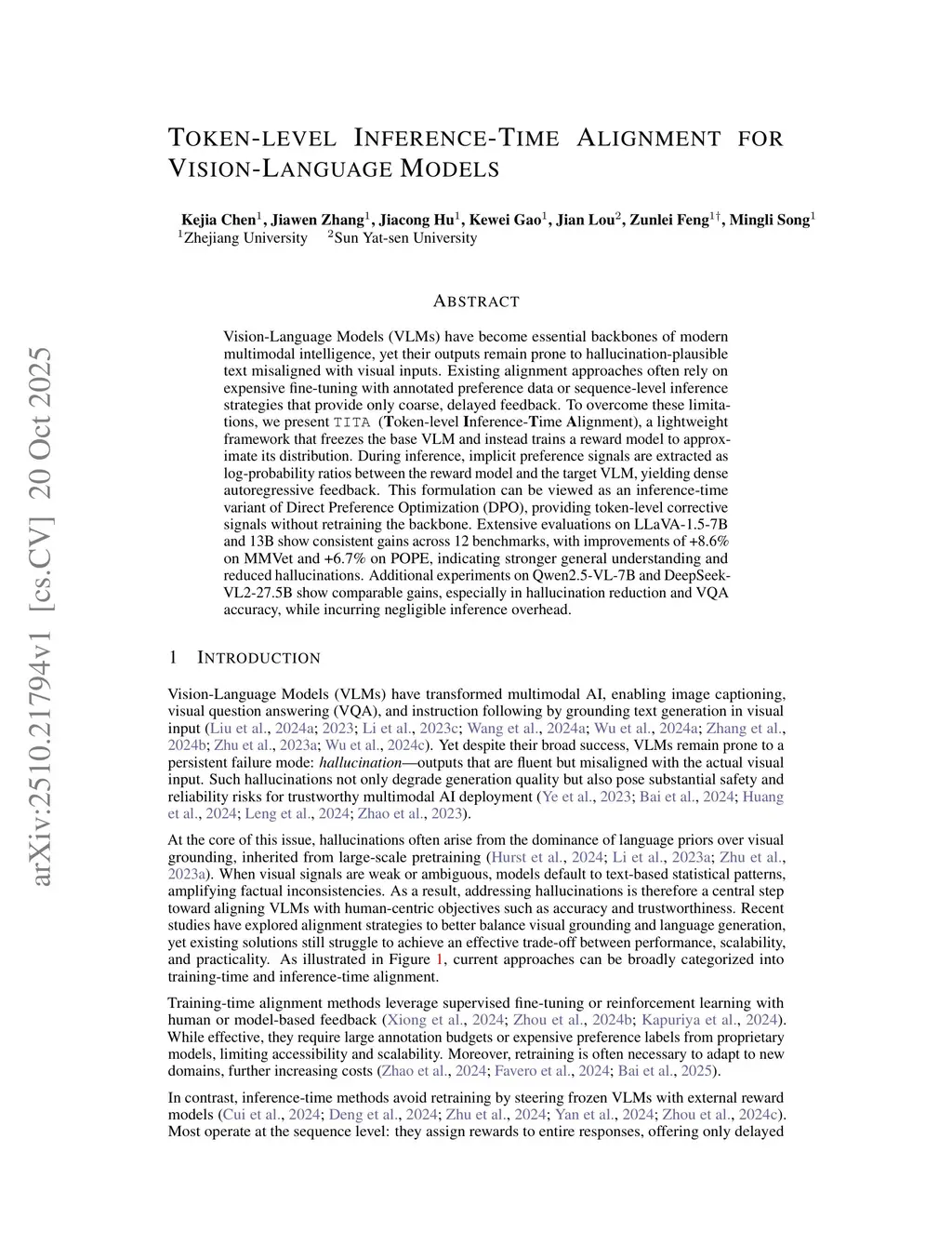 Vision-Language Models (VLMs) have become essential backbones of modern multimodal intelligence, yet their outputs remain prone to hallucination-plausible text misaligned with visual inputs. Existing alignment approaches often rely on expensive fine-tuning with annotated preference data or sequence-level inference strategies that provide only coarse, delayed feedback. To overcome these limitations, we present TITA (Token-level Inference-Time Alignment), a lightweight framework that freezes the base VLM and instead trains a reward model to approximate its distribution. During inference, implicit preference signals are extracted as log-probability ratios between the reward model and the target VLM, yielding dense autoregressive feedback. This formulation can be viewed as an inference-time variant of Direct Preference Optimization (DPO), providing token-level corrective signals without retraining the backbone. Extensive evaluations on LLaVA-1.5-7B and 13B show consistent gains across 12 benchmarks, with improvements of 8.6% on MMVet and 6.7% on POPE, indicating stronger general understanding and reduced hallucinations. Additional experiments on Qwen2.5-VL-7B and DeepSeek-VL2-27.5B show comparable gains, especially in hallucination reduction and VQA accuracy, while incurring negligible inference overhead.