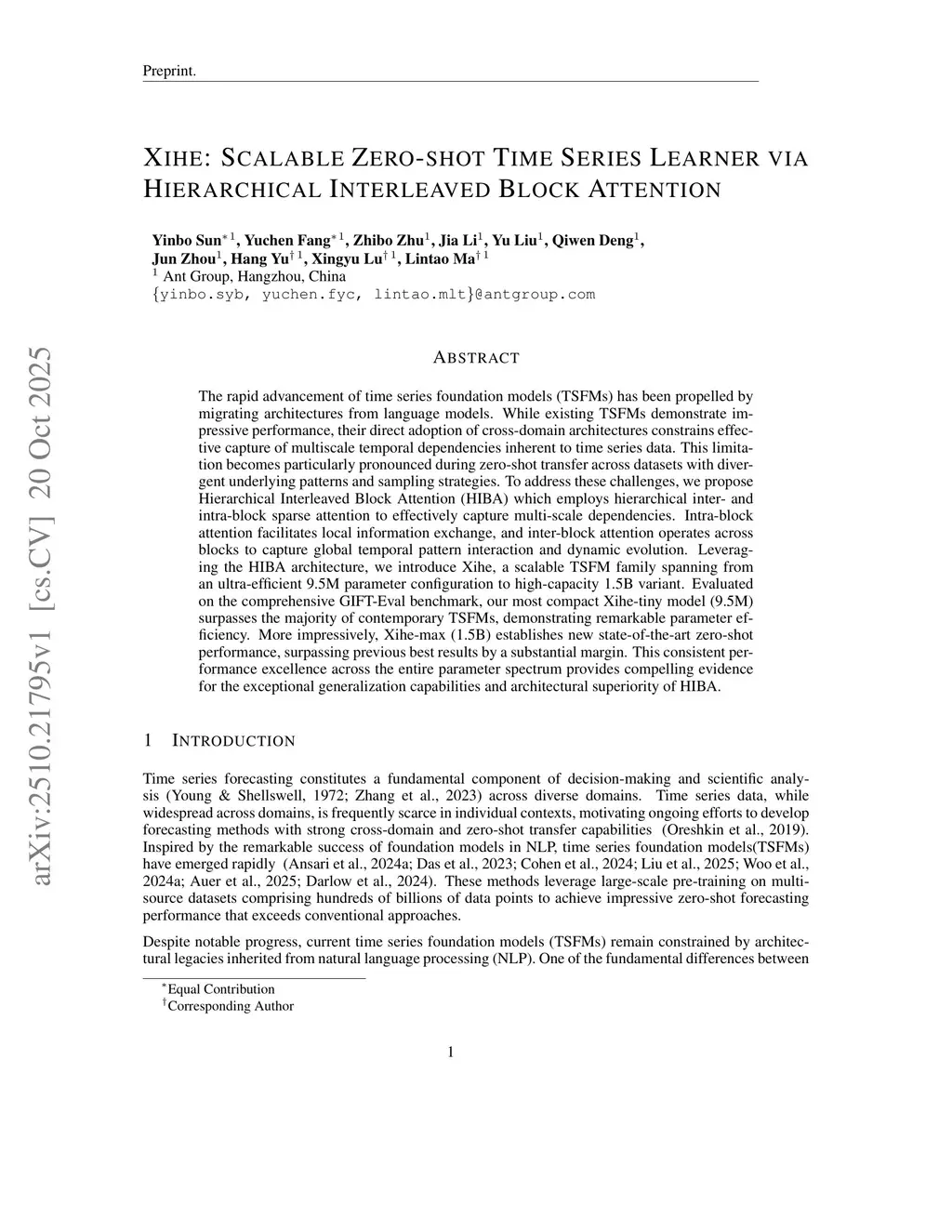 The rapid advancement of time series foundation models (TSFMs) has been propelled by migrating architectures from language models. While existing TSFMs demonstrate impressive performance, their direct adoption of cross-domain architectures constrains effective capture of multiscale temporal dependencies inherent to time series data. This limitation becomes particularly pronounced during zero-shot transfer across datasets with divergent underlying patterns and sampling strategies. To address these challenges, we propose Hierarchical Interleaved Block Attention (HIBA) which employs hierarchical inter- and intra-block sparse attention to effectively capture multi-scale dependencies. Intra-block attention facilitates local information exchange, and inter-block attention operates across blocks to capture global temporal pattern interaction and dynamic evolution. Leveraging the HIBA architecture, we introduce Xihe, a scalable TSFM family spanning from an ultra-efficient 9.5M parameter configuration to high-capacity 1.5B variant. Evaluated on the comprehensive GIFT-Eval benchmark, our most compact Xihe-tiny model (9.5M) surpasses the majority of contemporary TSFMs, demonstrating remarkable parameter efficiency. More impressively, Xihe-max (1.5B) establishes new state-of-the-art zero-shot performance, surpassing previous best results by a substantial margin. This consistent performance excellence across the entire parameter spectrum provides compelling evidence for the exceptional generalization capabilities and architectural superiority of HIBA.