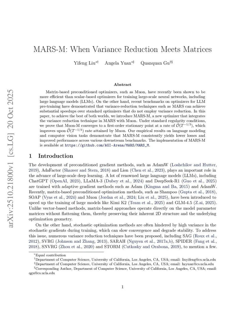 Matrix-based preconditioned optimizers, such as Muon, have recently been shown to be more efficient than scalar-based optimizers for training large-scale neural networks, including large language models (LLMs). Recent benchmark studies of LLM pretraining optimizers have demonstrated that variance-reduction techniques such as MARS can substantially speed up training compared with standard optimizers that do not employ variance reduction. In this paper, we introduce MARS-M, a new optimizer that integrates MARS-style variance reduction with Muon. Under standard regularity conditions, we prove that MARS-M converges to a first-order stationary point at a rate of , improving upon the rate attained by Muon. Empirical results on language modeling and computer vision tasks demonstrate that MARS-M consistently yields lower losses and improved performance across various downstream benchmarks. The implementation of MARS-M is available atthis https URL.