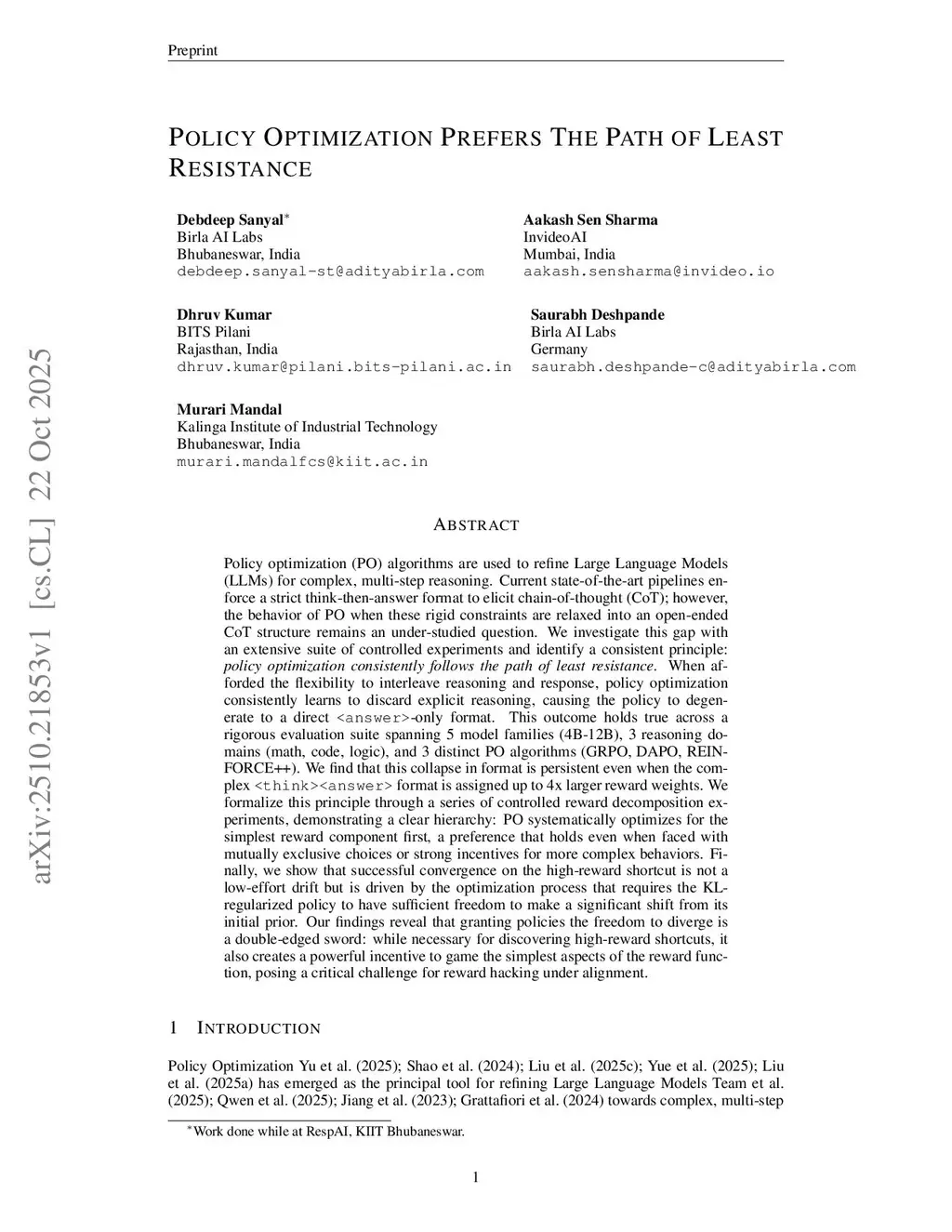 Policy optimization (PO) algorithms are used to refine Large Language Models for complex, multi-step reasoning. Current state-of-the-art pipelines enforce a strict think-then-answer format to elicit chain-of-thought (CoT); however, the behavior of PO when these rigid constraints are relaxed into an open-ended CoT structure remains an under-studied question. We investigate this gap with an extensive suite of controlled experiments and identify a consistent principle: \textit{policy optimization consistently follows the path of least resistance}. When afforded the flexibility to interleave reasoning and response, policy optimization consistently learns to discard explicit reasoning, causing the policy to degenerate to a direct \texttt{<answer>}-only format. This outcome holds true across various models and algorithms. We find that this collapse in format is persistent even when the complex \texttt{<think><answer>} format is assigned up to 4x larger reward weights. We formalize this principle through a series of controlled reward decomposition experiments, demonstrating a clear hierarchy: PO systematically optimizes for the simplest reward component first, a preference that holds even when faced with mutually exclusive choices or strong incentives for more complex behaviors. Finally, we show that successful convergence on the high-reward shortcut is not a low-effort drift but is driven by the optimization process that requires the KL-regularized policy to have sufficient freedom to make a significant shift from its initial prior. Our findings reveal that granting policies the freedom to diverge is a double-edged sword: while necessary for discovering high-reward shortcuts, it also creates a powerful incentive to game the simplest aspects of the reward function, posing a critical challenge for reward hacking under alignment.