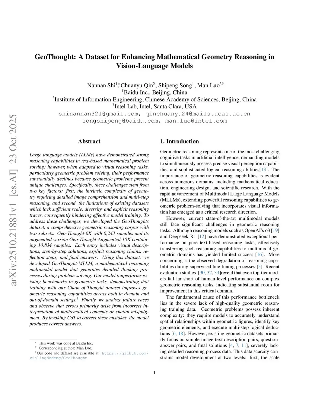 Large language models (LLMs) have demonstrated strong reasoning capabilities in text-based mathematical problem solving; however, when adapted to visual reasoning tasks, particularly geometric problem solving, their performance substantially declines because geometric problems present unique challenges. Specifically, these challenges stem from two key factors: first, the intrinsic complexity of geometry requiring detailed image comprehension and multi-step reasoning, and second, the limitations of existing datasets which lack sufficient scale, diversity, and explicit reasoning traces, consequently hindering effective model training. To address these challenges, we developed the GeoThoughts dataset, a comprehensive geometric reasoning corpus with two subsets: Geo-Thought-6K with 6,243 samples and its augmented version Geo-Thought-Augmented-10K containing 10,834 samples. Each entry includes visual descriptions, step-by-step solutions, explicit reasoning chains, reflection steps, and final answers. Using this dataset, we developed GeoThought-MLLM, a mathematical reasoning multimodal model that generates detailed thinking processes during problem-solving. Our model outperforms existing benchmarks in geometric tasks, demonstrating that training with our Chain-of-Thought dataset improves geometric reasoning capabilities across both in-domain and out-of-domain settings. Finally, we analyze failure cases and observe that errors primarily arise from incorrect interpretation of mathematical concepts or spatial misjudgment. By invoking CoT to correct these mistakes, the model produces correct answers.